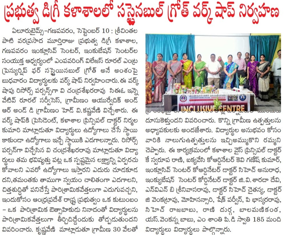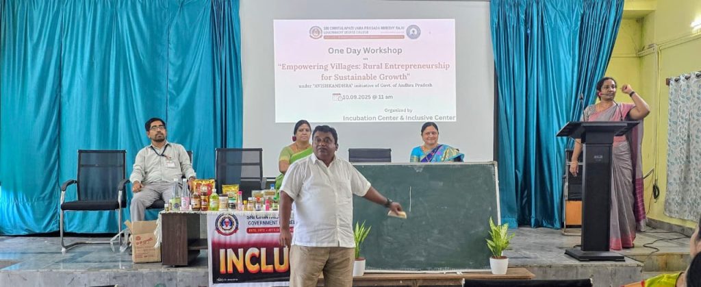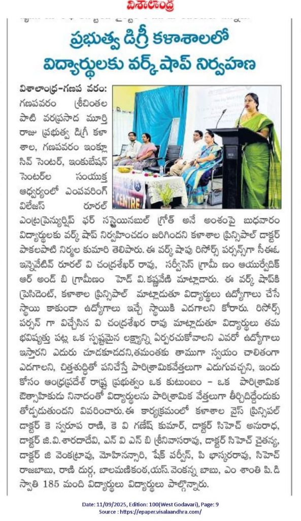 The Incubation Centre and Inclusive Centre of Government Degree College, Ganapavaram, organized a workshop on “Empowering Villages: Rural Entrepreneurship for Sustainable Growth” on 10.09.2025. The program aimed to motivate students towards entrepreneurship and create awareness about opportunities in rural enterprise development.