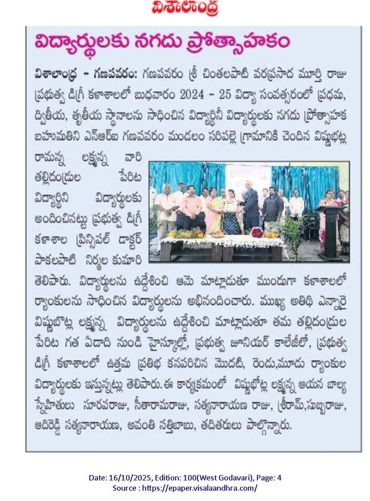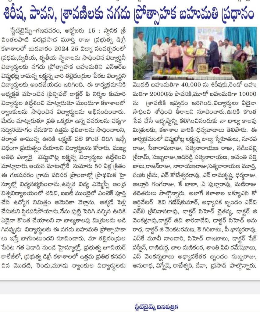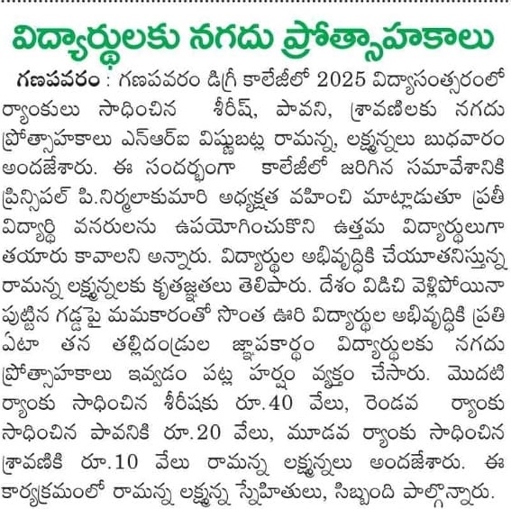 Sri Chintalapati Varaprasada Murthy Raju Government Degree College, Ganapavaram, proudly conducted the Merit Scholarship Awards Programme 2024-25 to honor and recognize the remarkable academic achievements of its students. This esteemed event continues the tradition of encouraging excellence and is generously supported by dedicated sponsors.