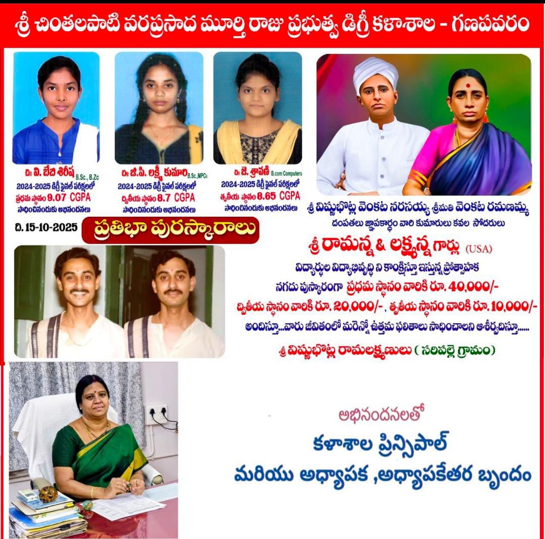 Sri Chintalapati Varaprasada Murthy Raju Government Degree College, Ganapavaram, proudly conducted the Merit Scholarship Awards Programme 2024-25 to honor and recognize the remarkable academic achievements of its students. This esteemed event continues the tradition of encouraging excellence and is generously supported by dedicated sponsors.