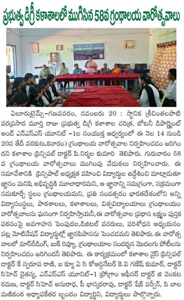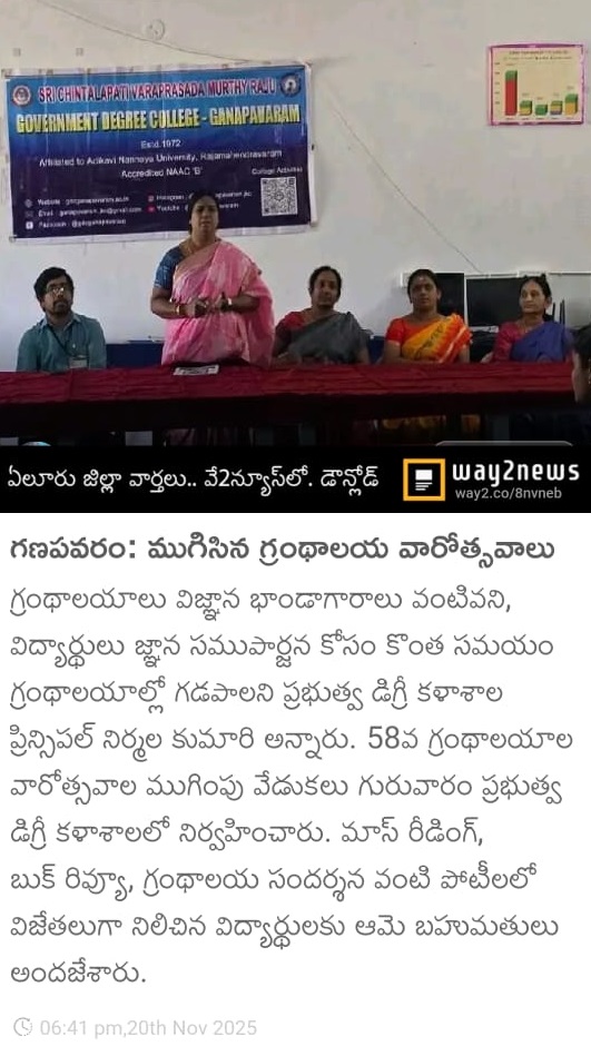 As part of the 58th National Library Week celebrations held from 14 to 20 November 2025, S.Ch.V.P.M.R. Government Degree College, Ganapavaram organized a series of activities to promote reading habits and library usage among students. The week-long observance aimed at fostering intellectual curiosity, enhancing information literacy, and encouraging active engagement with books and library resources.