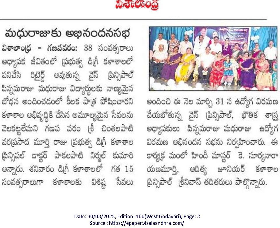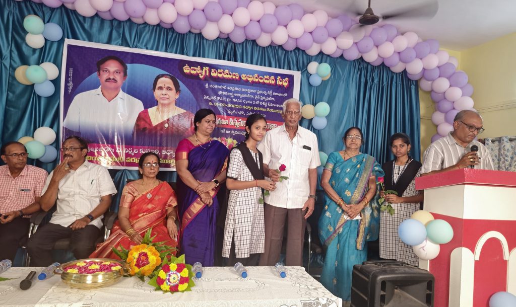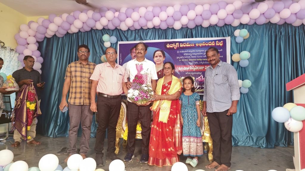 A heartfelt retirement felicitation ceremony was held on March 29, 2025, honoring Sri Pinnamaraju Madhuraju Garu, Vice Principal and esteemed faculty member of the Physics Department. Having dedicated 15 remarkable years to the college and a total of 38 years to teaching, Sri Madhuraju garu leaves behind a legacy of academic excellence and institutional development and retires from service on 31.03.2025.