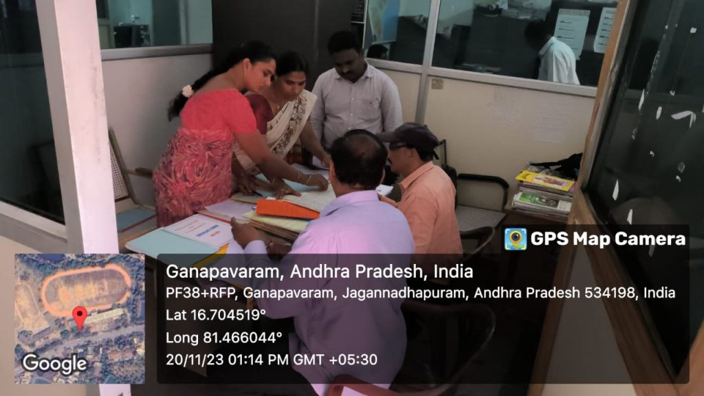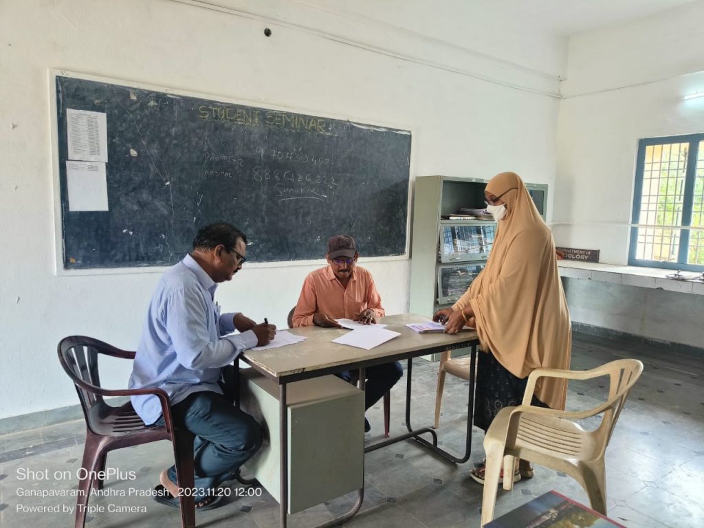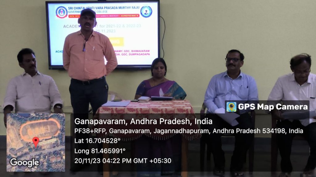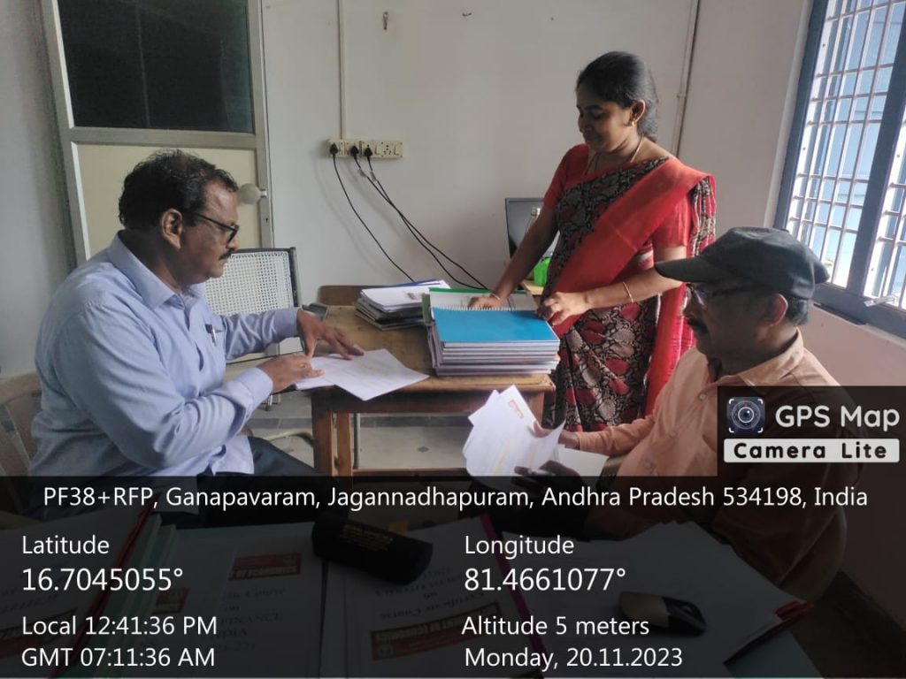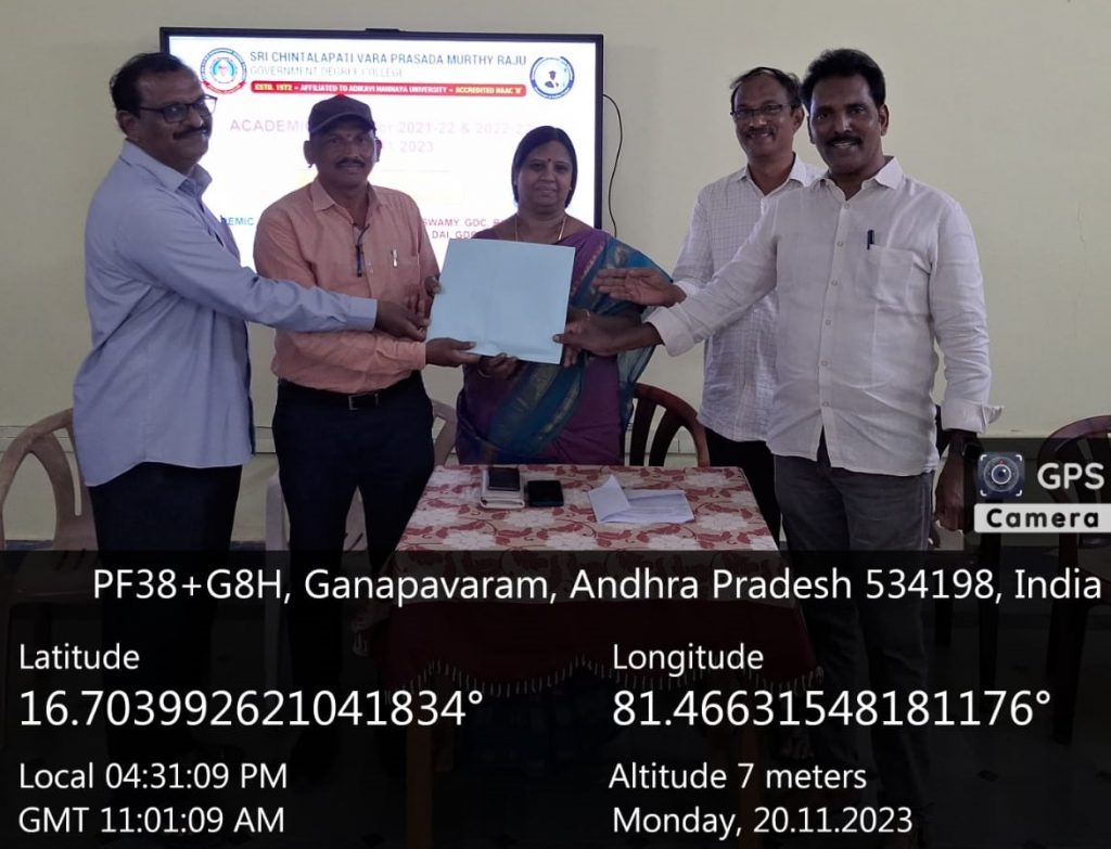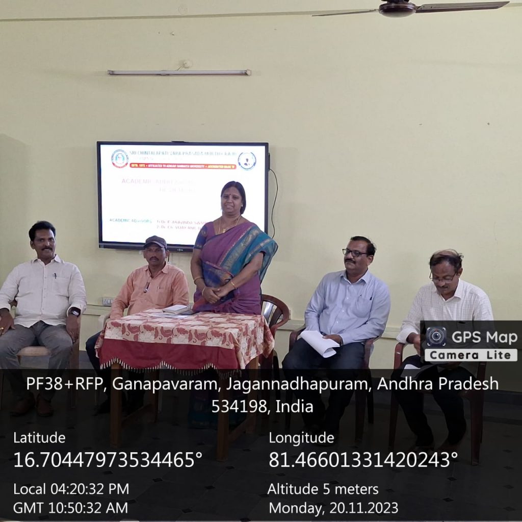 In compliance to the proceedings of the Commisionerate of Collegiate Education, A.P Academic Audit of the institution for 2021-22 & 2022-23 was successfully conducted on 20th November 2023. Academic Advisors Sri Ch.Vijay Anil Dai, GDC Dumpagadapa and Sri P.Arawind Swamy, GDC Bhimavaram visited the institution and verified the documentation of all the departments as per the stipulated formats and awarded grades. The audit team also gave constructive suggestions for the development of the institution. The institution procured ‘A’ grade in the assessment. Principal Dr.P.Nirmala Kumari, IQAC Coordnator Dr.T.Akkiraju and Vice-principal Sri P.Madhuraju monitored the audit process.