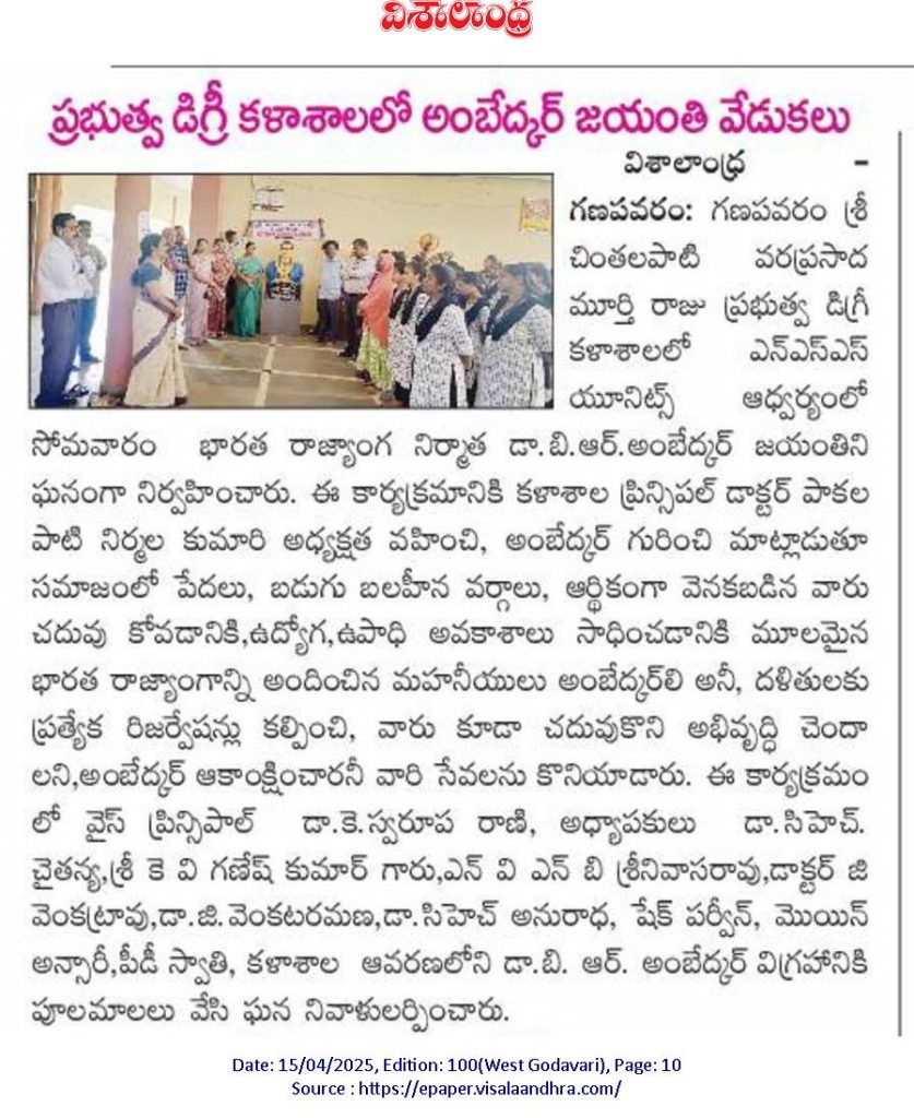 Government Degree College, Ganapavaram solemnly observed Ambedkar Jayanthi on 14th April 2025 to commemorate the birth anniversary of Dr. B.R. Ambedkar, the architect of the Indian Constitution and a champion of social justice.