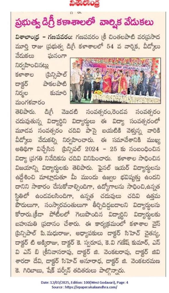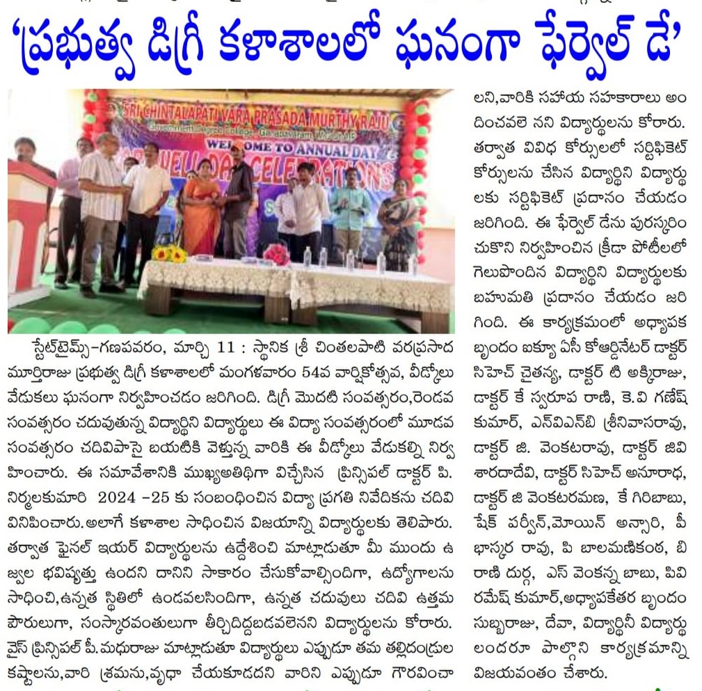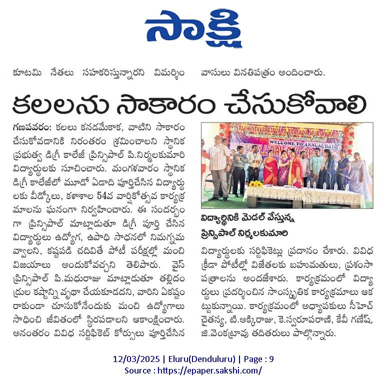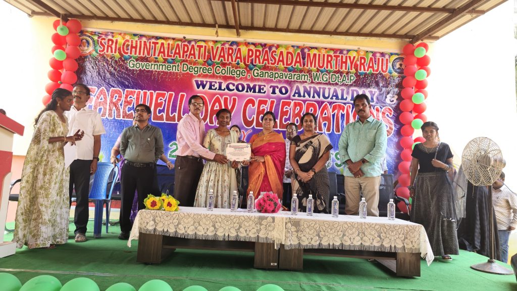The program commenced with an invocation song, followed by a welcome address delivered by the Principal, Dr. P. Nirmala Kumari, who highlighted the college’s progress over the academic year and encouraged students to pursue excellence in their future endeavors. The Vice Principal, Sri P. Madhu Raju, and IQAC Coordinator, Dr. Ch. Chaitanya, emphasized the importance of lifelong learning and urged students to uphold the values instilled in them during their time at the institution.