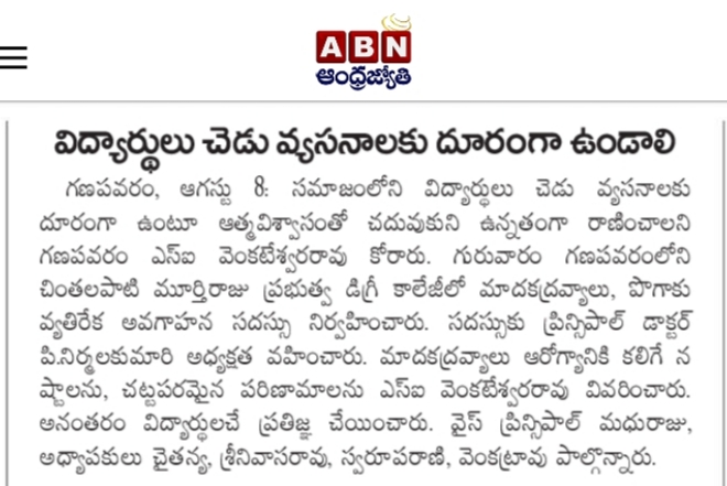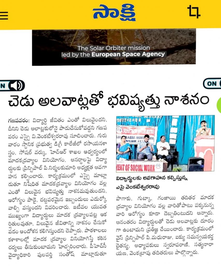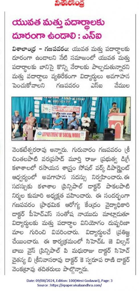 Sri V. Venkateswara Rao, SI of Police, Ganapavaram PS, Dr. PHS Santhosh, Civil Assistant Surgeon, and Sri Wilson, Community Health Officer, PHC, Ganapavaram, were the resource persons. All teaching and non-teaching staff, along with students from I, II, and III years, attended the program. At the end, prizes were distributed to the winners and participants of the poster and slogan competitions.