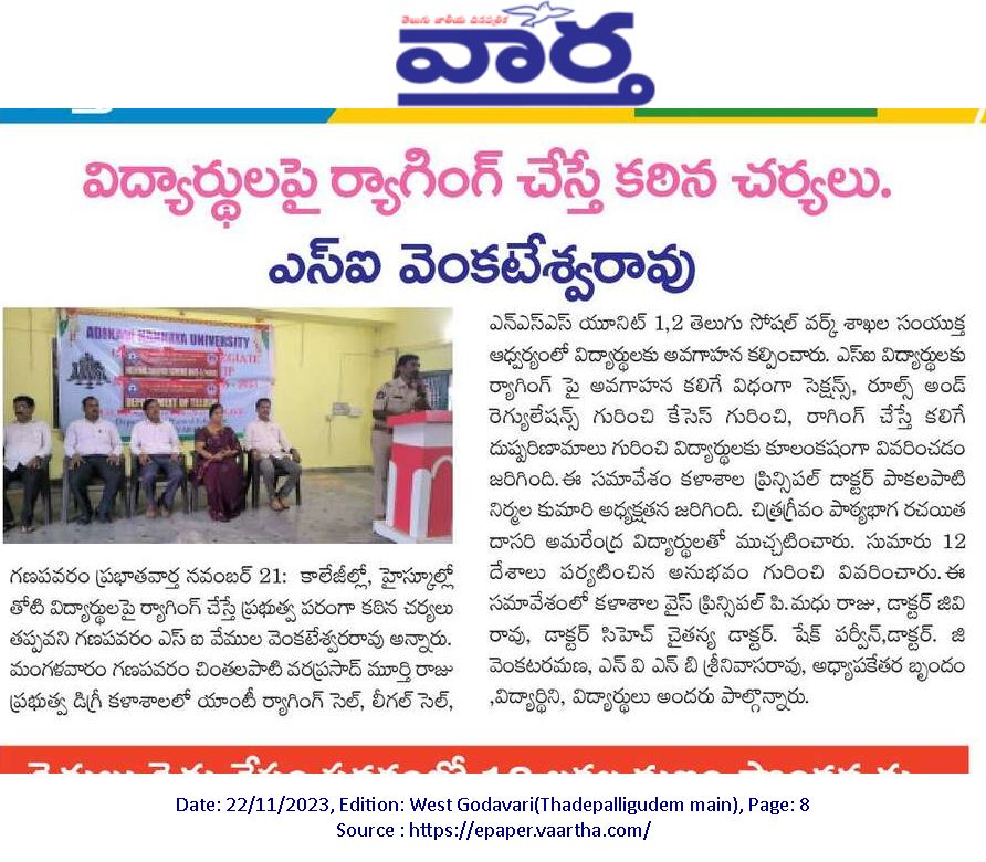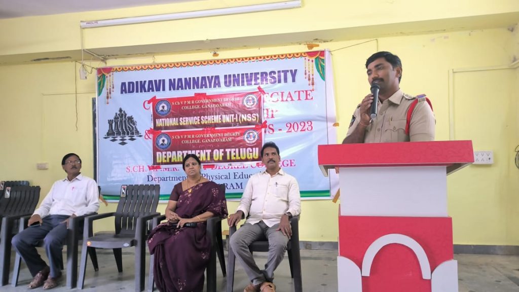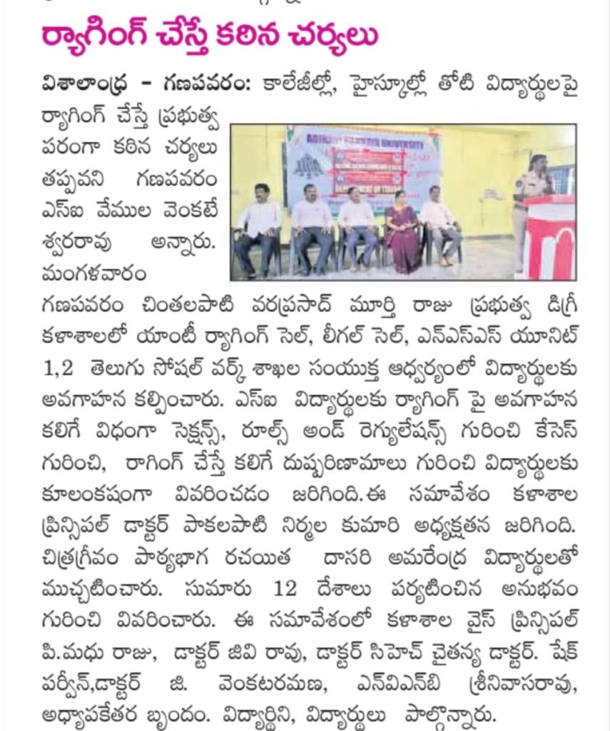 Anti Ragging Cell of the institution in association with NSS Units 1& 2 and the Department of Telugu and Department of Social work have conducted an Awareness Program on Anti-Ragging to the first year students. The principal Dr.P.Nirmala Kumari is the chair of the session and the Chief Guest V. Venkateswara Rao, Sub Inspector of Police (S.I), Ganapavaram interacted with our college students and explained the rules and the cases about the ragging. And also he informed the toll free number for the students. Dr. T. Akkiraju IQAC Coordinator, Dr.G Venkat Rao, Dr.G.Venkataramana, Shri P. Bhaskar Rao and the students participated in the program. Finally the principal Dr. P.Nirmala Kumari honoured Venkateswara Rao, S.I with shawl and College memento.