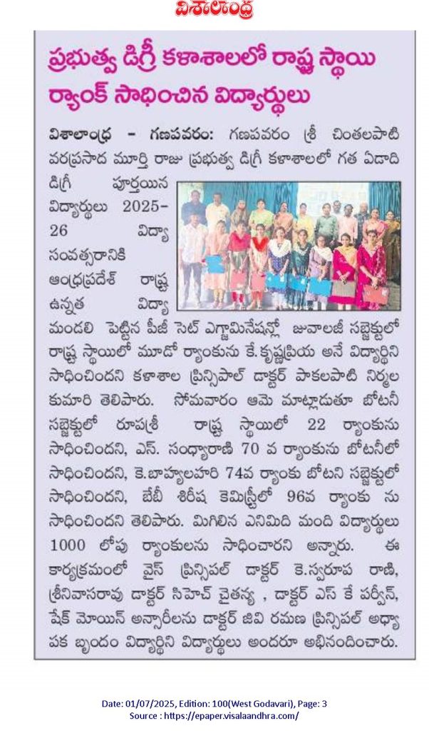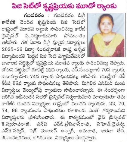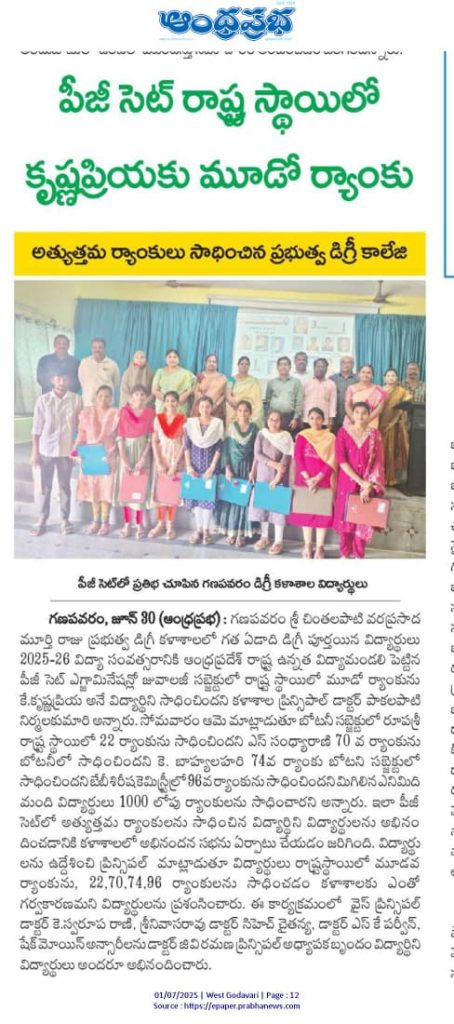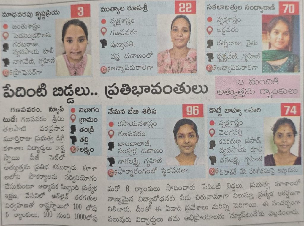 The students of S.Ch.V.P.M.R. Government Degree College, Ganapavaram have brought laurels to the institution by securing commendable ranks in the Andhra Pradesh Post Graduate Common Entrance Test (APPGCET) 2024 across various subjects.