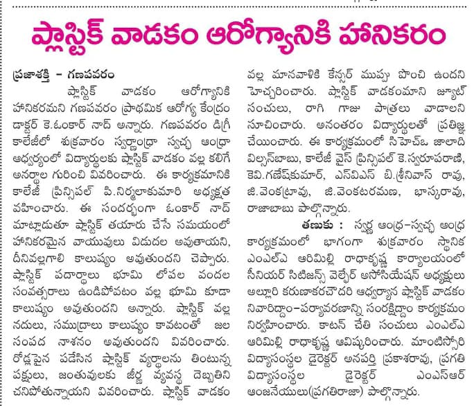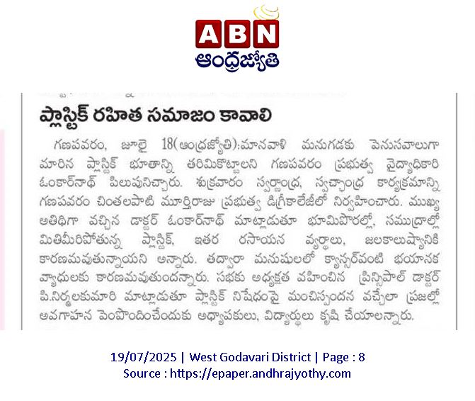 “Swarna Andhra – Swachha Andhra” (SASA) is a flagship initiative launched by the Government of Andhra Pradesh aiming at the holistic development of the state by 2047. As part of the SASA’s July theme “Ending Plastic Pollution”, an Awareness Programme was conducted at Sri Chintalapati Varaprasada Murthy Raju Government Degree College, Ganapavaram on 19.07.2025.
