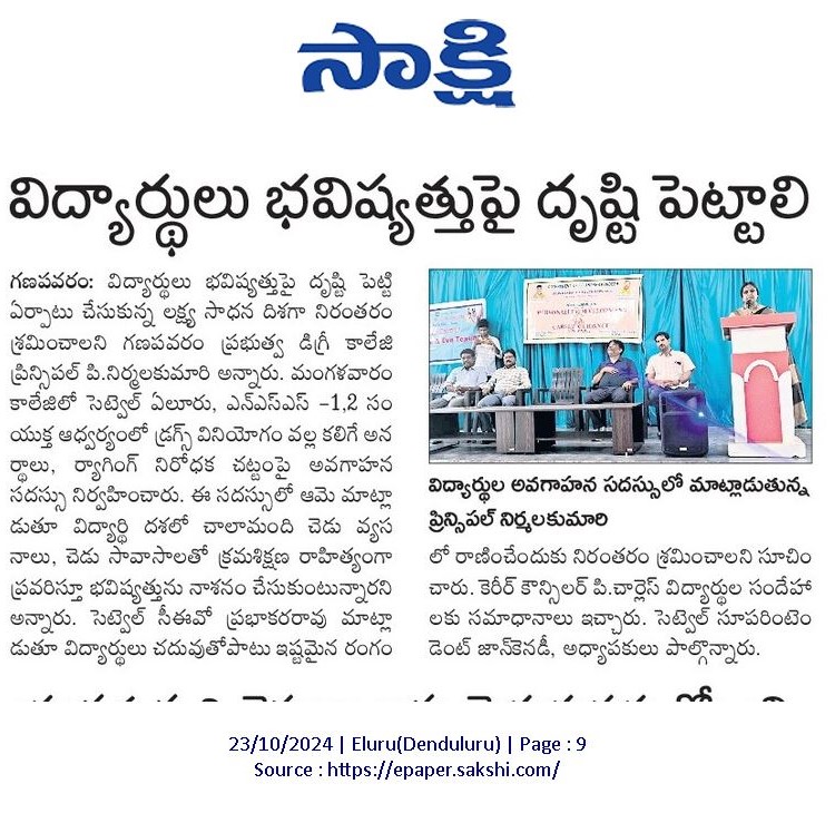 The program, organized by NSS Units 1 and 2 in collaboration with SETWEL Eluru, was well-received by students. Principal Dr. P. Nirmala Kumari applauded the initiative and encouraged students to apply the insights from the session in their academic and personal lives. Sri NVNB Srinivasarao, Lecturer in Chemistry shared his valuable insights on Goal Setting.