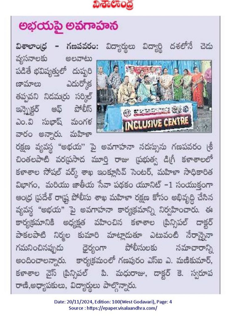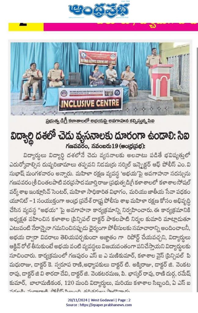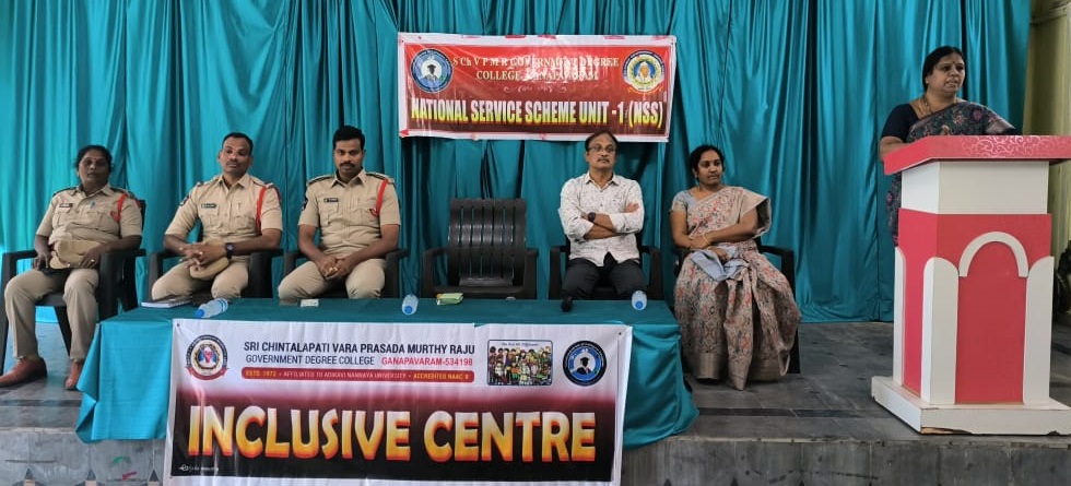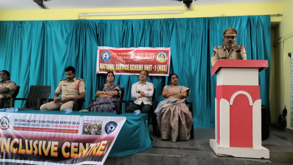 The Women Empowerment Cell and the Inclusive Center in association with the Dept. of Social Work and NSS Unit – I organized an awareness session on “ABHAYA”, the new security system developed by the Department of Police, Andhra Pradesh which facilitates anonymous reporting of crimes. Sri M. V. Subhash, Circle Inspector of Police and Sri A. Mani Kumar, Sub-Inspector of Police, Ganapavaram was invited as resource persons for the session. They detailed students about the unique features of ABHAYA in particular and harmful effects of ragging, substance use, usage of social media, excessive screen time, cyber financial crimes etc. in general. Dr. P. Nirmala Kumari, honorable principal of the college addressed the students and suggested them to adopt a healthy lifestyle. Other police personnel, teaching and non-teaching staff of the college and 125 students attended the session.