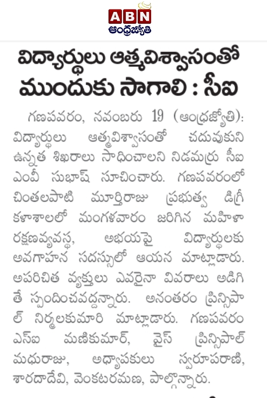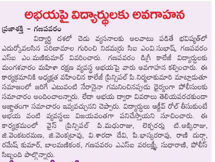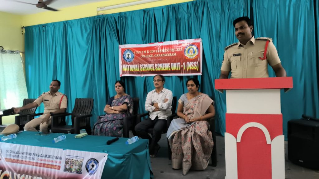 Experts from the Police Department shared real-life case studies and emphasized the importance of maintaining digital privacy and security. They also addressed queries from students, providing clarity on how to report and handle cyberbullying. Sri M. V. Subhash, Circle Inspector of Police and Sri A. Mani Kumar, Sub-Inspector of Police, Ganapavaram was invited as resource persons for the session. They detailed students about the unique features of ABHAYA in particular and harmful effects of ragging, substance use, usage of social media, excessive screen time, cyber financial crimes etc. in general. Dr. P. Nirmala Kumari, honorable principal of the college addressed the students and suggested them to adopt a healthy lifestyle. Other police personnel, teaching and non-teaching staff of the college and 125 students attended the session.
