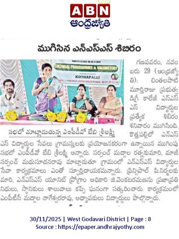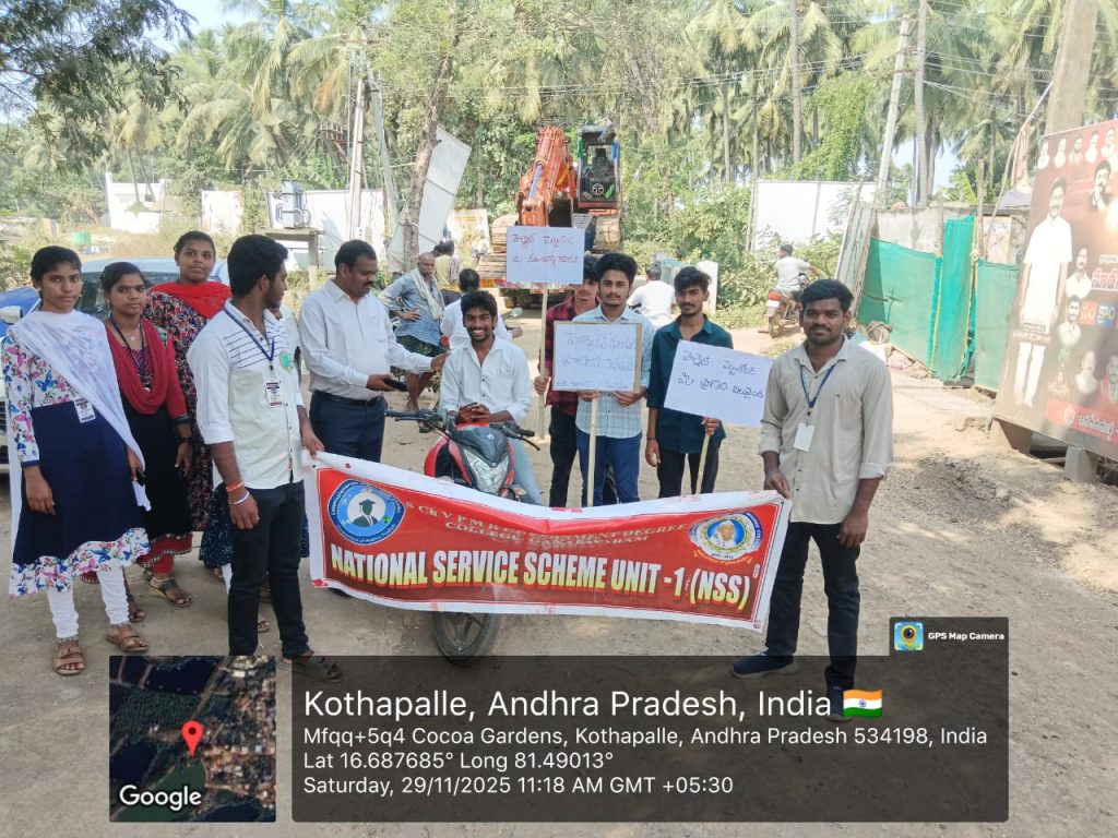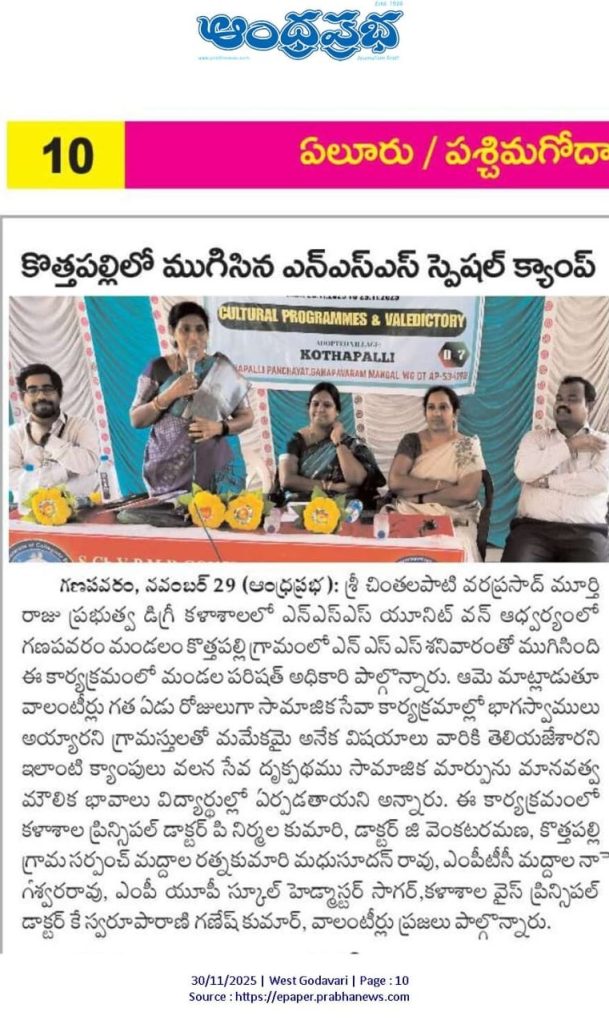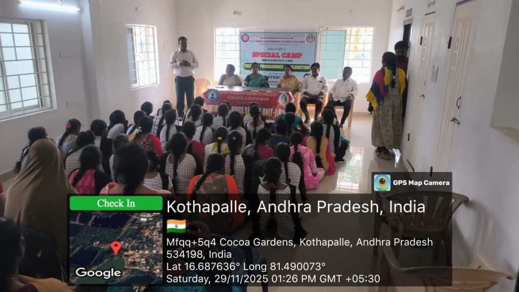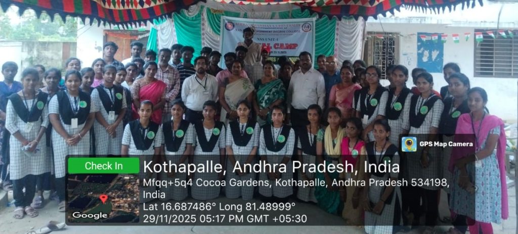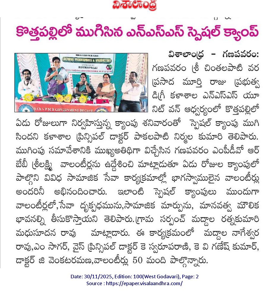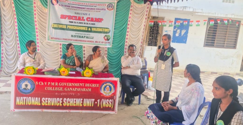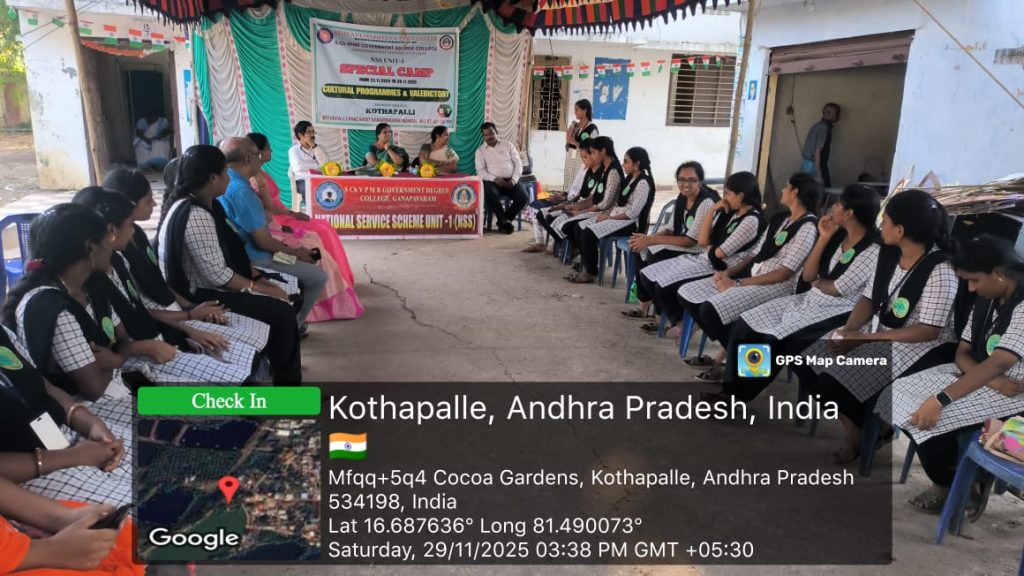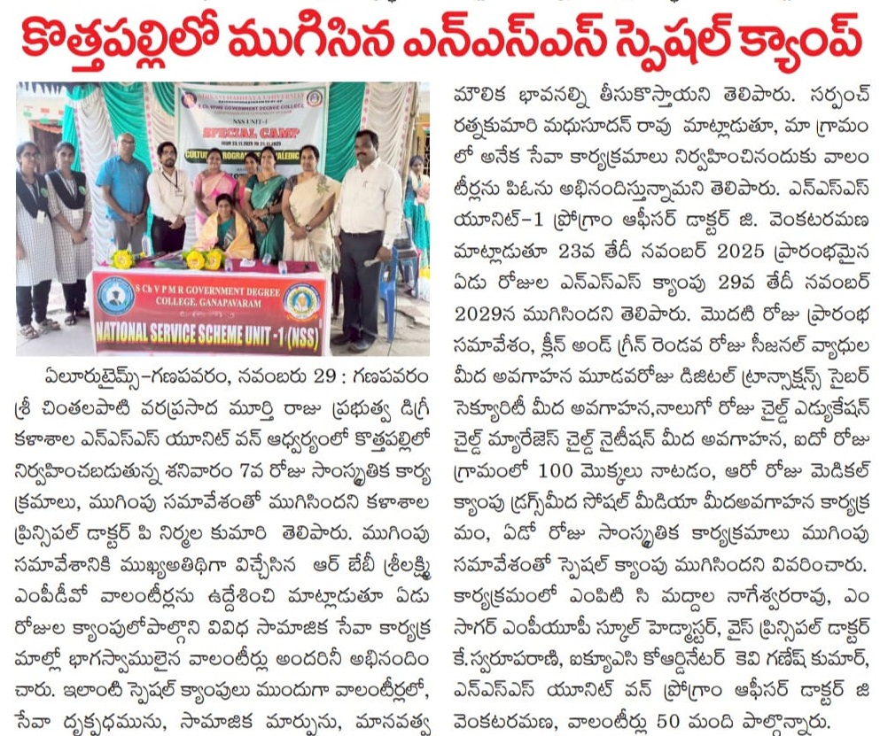 The NSS Unit–I of S.Ch.V.P.M.R. Government Degree College, Ganapavaram successfully concluded the 7-Day NSS Special Camp at Kottapalli Village on 29 November 2025 with the participation of 50 NSS Student Volunteers. The camp was conducted under the guidance of NSS Programme Officer Dr. G. Venkata Ramana from 23 to 29 November 2025.