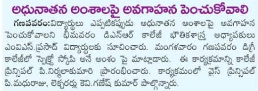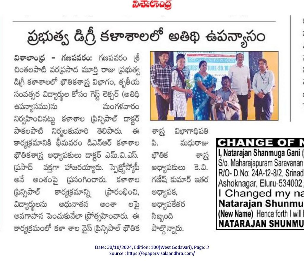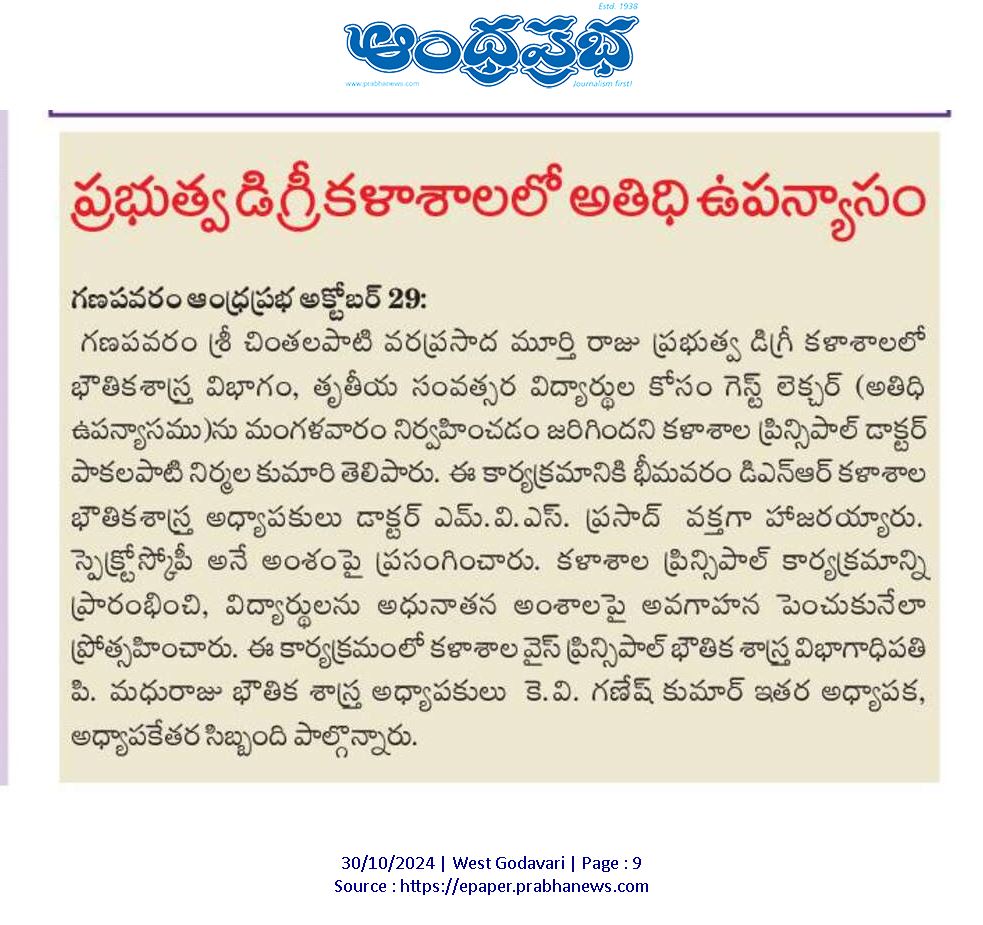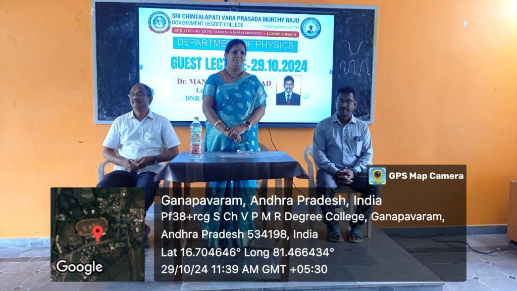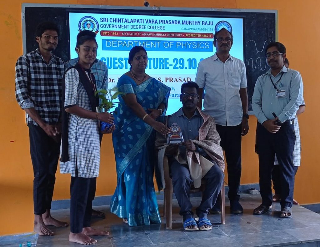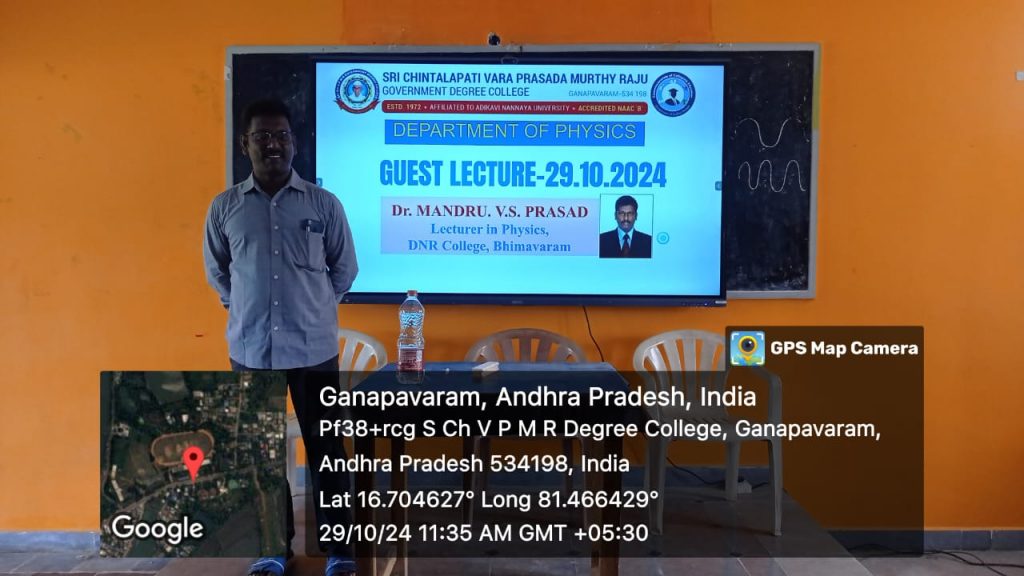 The Department of Physics at Government Degree College (GDC), Ganapavaram, organized an insightful guest lecture for final-year students on October 29, 2024. The session was led by Dr. M.V.S. Prasad, a distinguished lecturer in Physics from DNR College, Bhimavaram, who is well-regarded for his expertise in the field of Spectroscopy. The topic of the lecture was “Spectroscopy” a vital area of study in physics that explores the interaction of light and matter, essential for a wide array of scientific and technological applications.