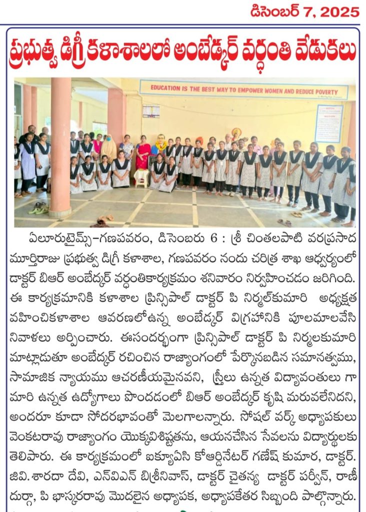 The Department of History of S. Ch. V. P. M. R. Government Degree College, Ganapavaram organized a programme on the occasion of the Death Anniversary of Dr. B. R. Ambedkar.
