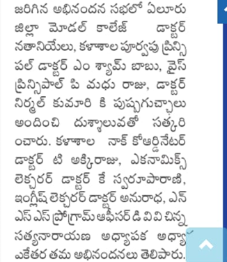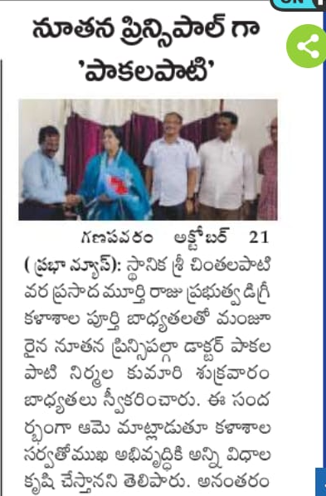 As per the proceedings of the Commissioner of College Education, Govt. of Andhra Pradesh, Dr. P. Nirmalakumari assumed charge as the Principal of SCHVPMR Govt. Degree College on 20.10.2022. Dr. S. Nathaniel, Principal of the Id College, Kamavarapukota, the staff and students of GDC, Ganapavaram congratulated the new Principal who had a brief interaction with the staff.