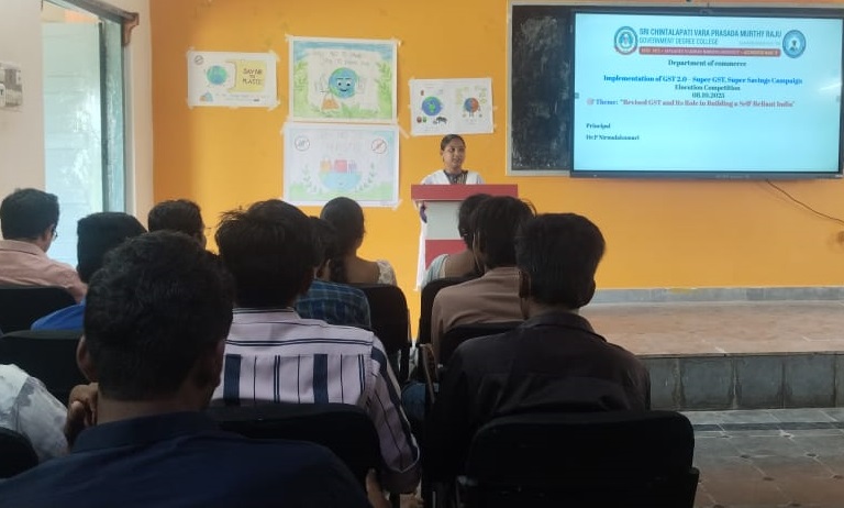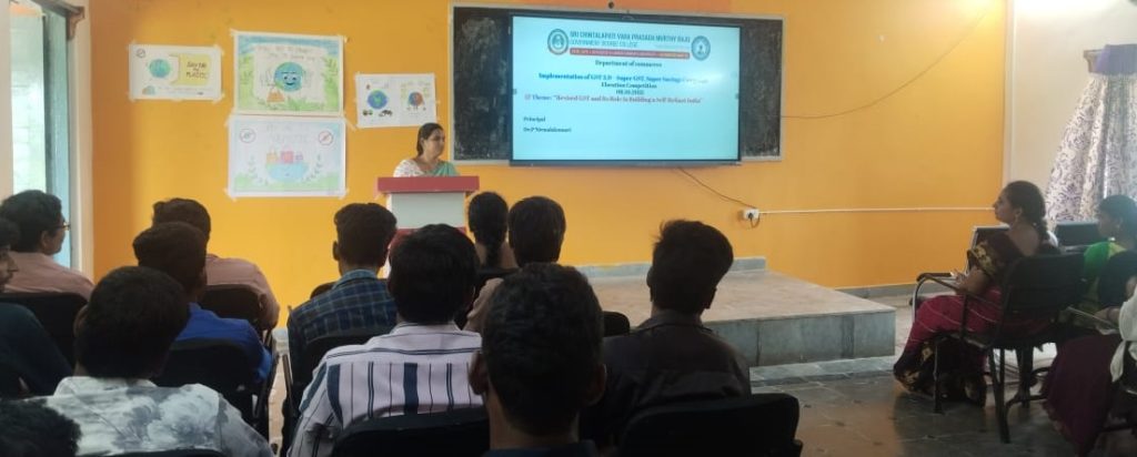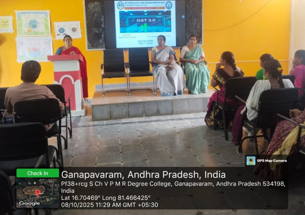 Commerce faculty members Smt. B. Rani Durga, Smt. P. Bala Manikanta, and Sri S. Venkanna Babu presented a PPT on GST 2.0 reforms, adding academic depth to the event.