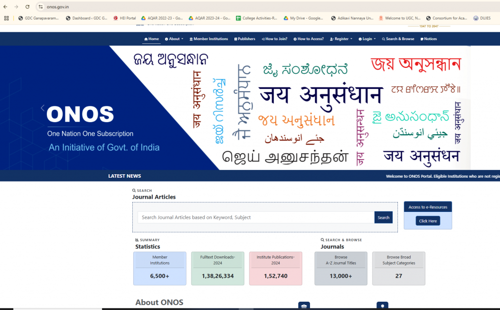 The institution has successfully registered under the One Nation One Subscription (ONOS) initiative, a prestigious national-level program aimed at providing seamless access to high-quality research journals and academic resources. This initiative marks a significant step in enhancing the research ecosystem within the college by ensuring faculty and students have unrestricted access to a vast repository of scientific and scholarly publications.