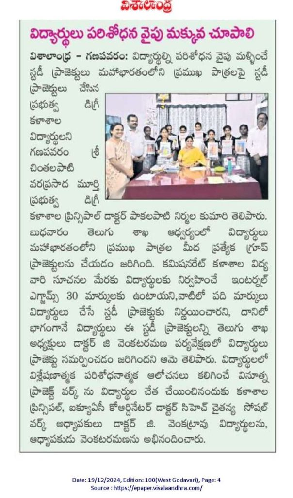 The project was guided by Dr. G. Venkata Ramana, Lecturer in Telugu, who encouraged students to delve into the complexities of Mahabharata’s characters and their relevance in contemporary times.