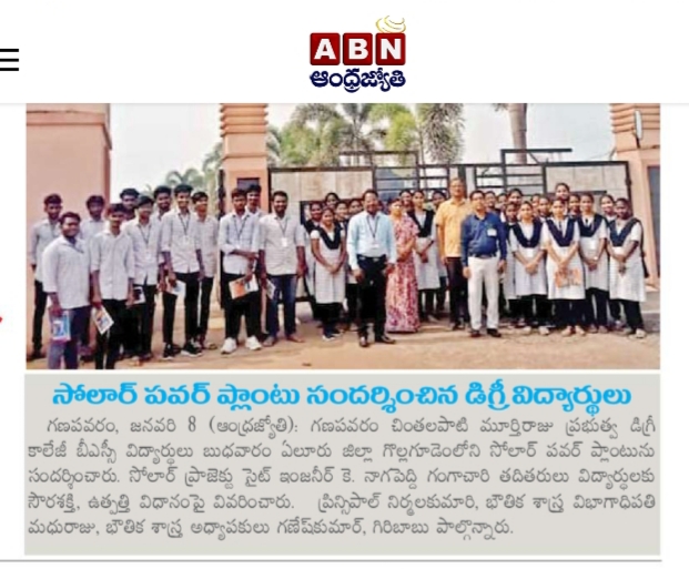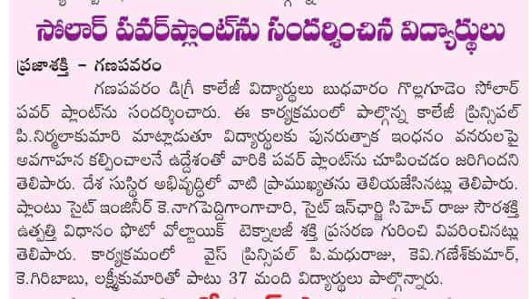 On 08.01.2025, students from II B.Sc (Hons) Computer Science, II B.Sc (Chemistry-Physics Minor), and III B.Sc (M.P.Cs) (a total of 38 students) visited the APGENCO 5 MW Solar Plant at Gollagudem near Chebrole as part of their academic curriculum. The visit provided a practical understanding of renewable energy production and solar power technology.