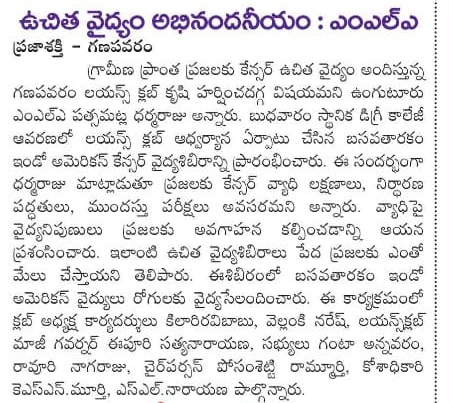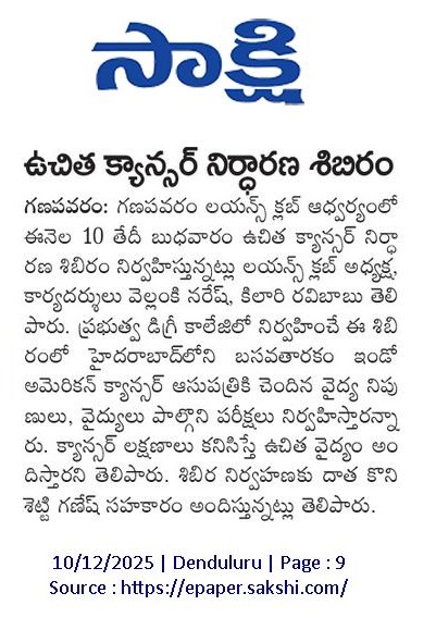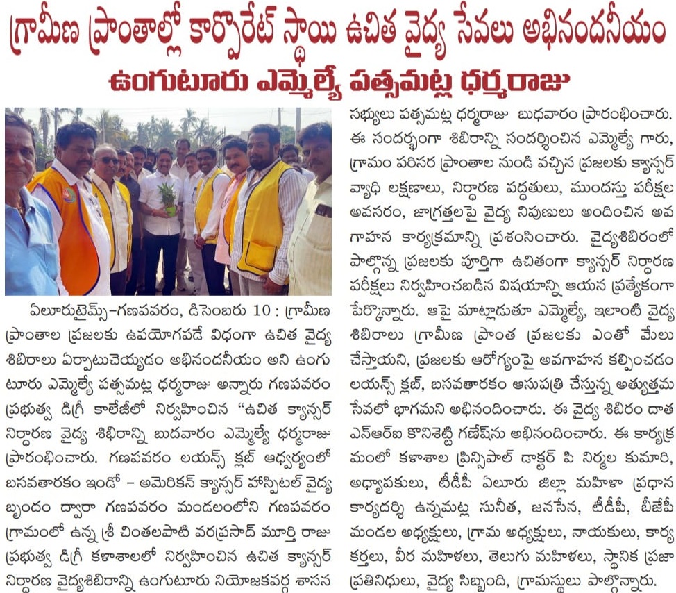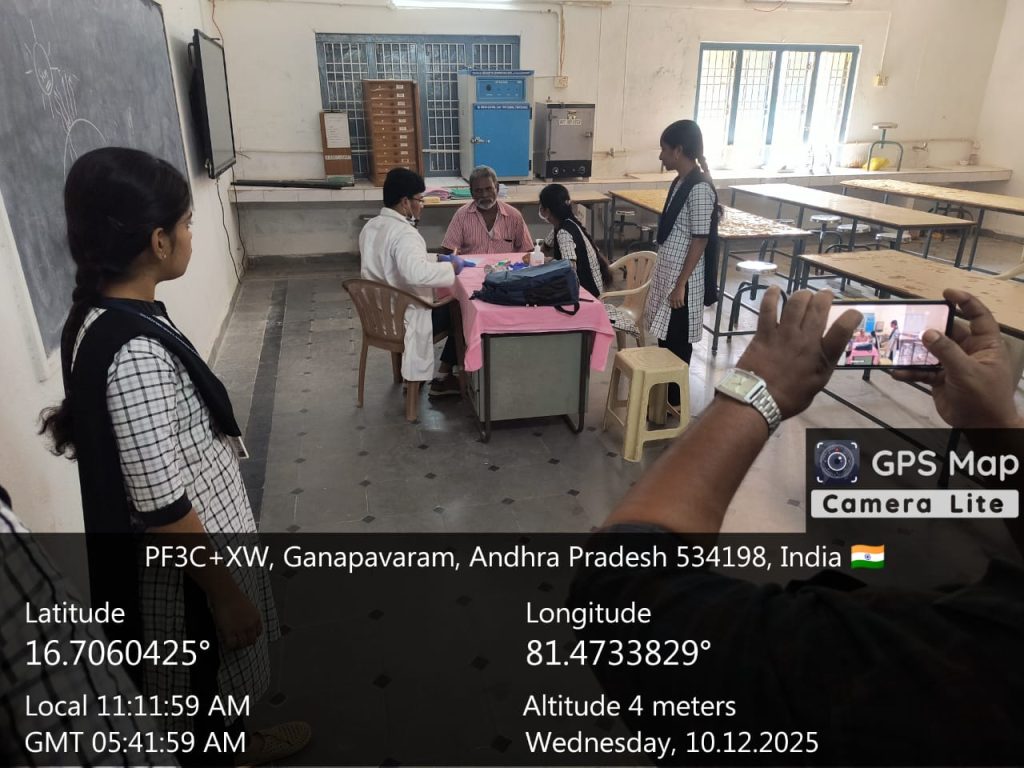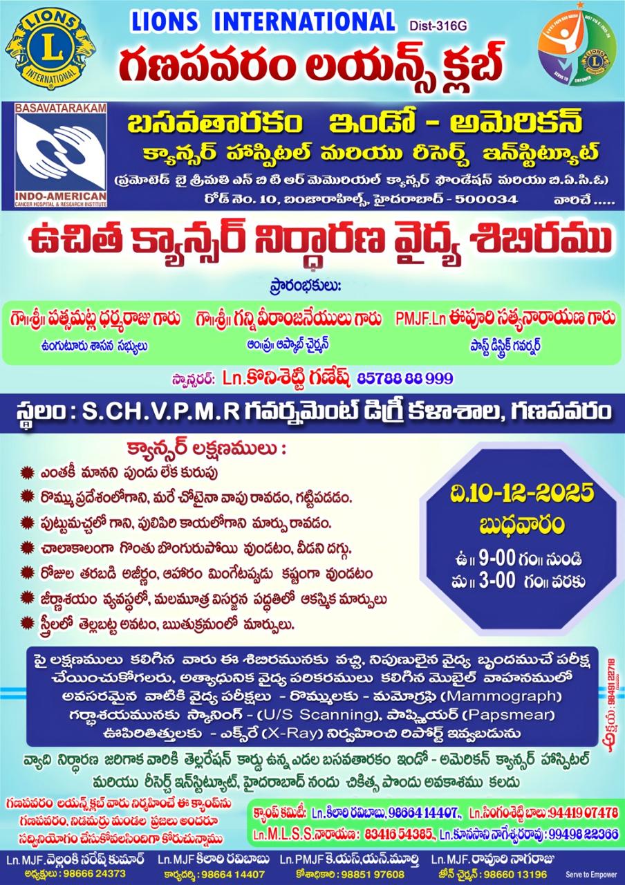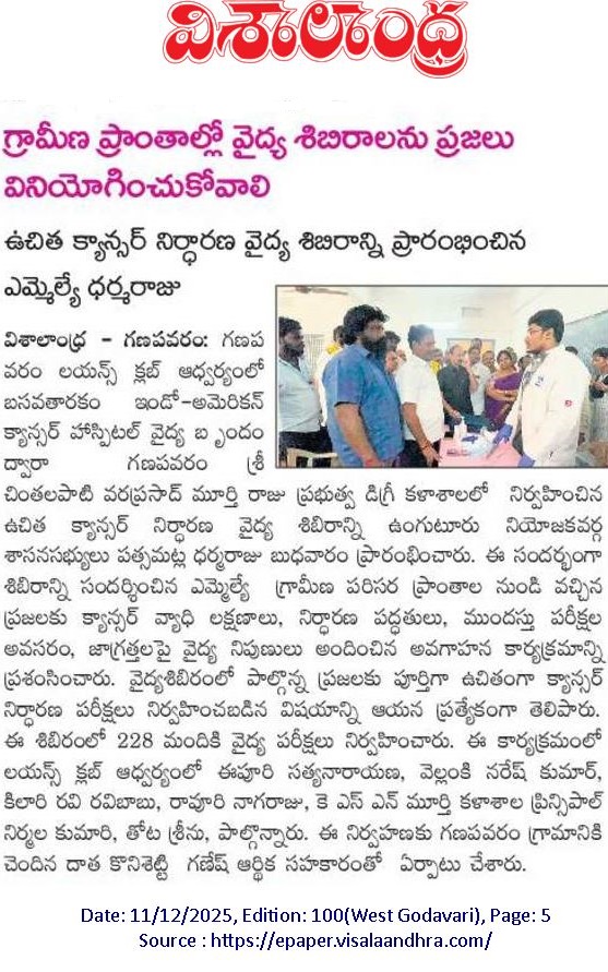 A Free Cancer Screening Camp was organized at Sri Chintalapati Vara Prasada Murthy Raju Government Degree College, Ganapavaram by the Lions Club, Ganapavaram, in collaboration with the IQAC and NSS Units–I & II of the college. The camp was inaugurated by Unguturu MLA Sri Patsamatla Dharmaraju garu, who highlighted the importance of early cancer detection and appreciated the Lions Club and the college for bringing quality health services to rural communities.