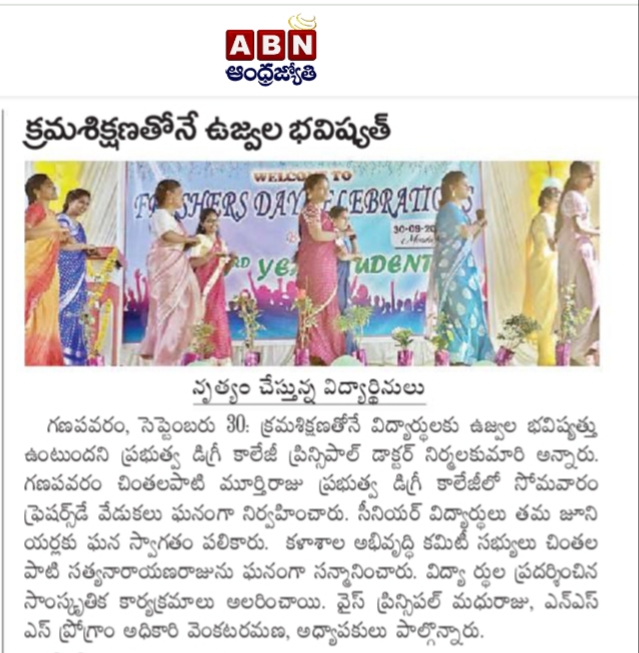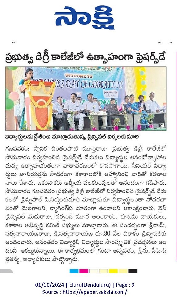 On 30th September 2024, GDC Ganapavaram warmly welcomed the newly admitted students of the 2024-25 batch with a grand Freshers’ Day celebration. Principal, Dr. P. Nirmala Kumari, in her address, encouraged the students to make full use of the opportunities offered by the college and to uphold discipline, dedication, and ethics in their academic pursuits.