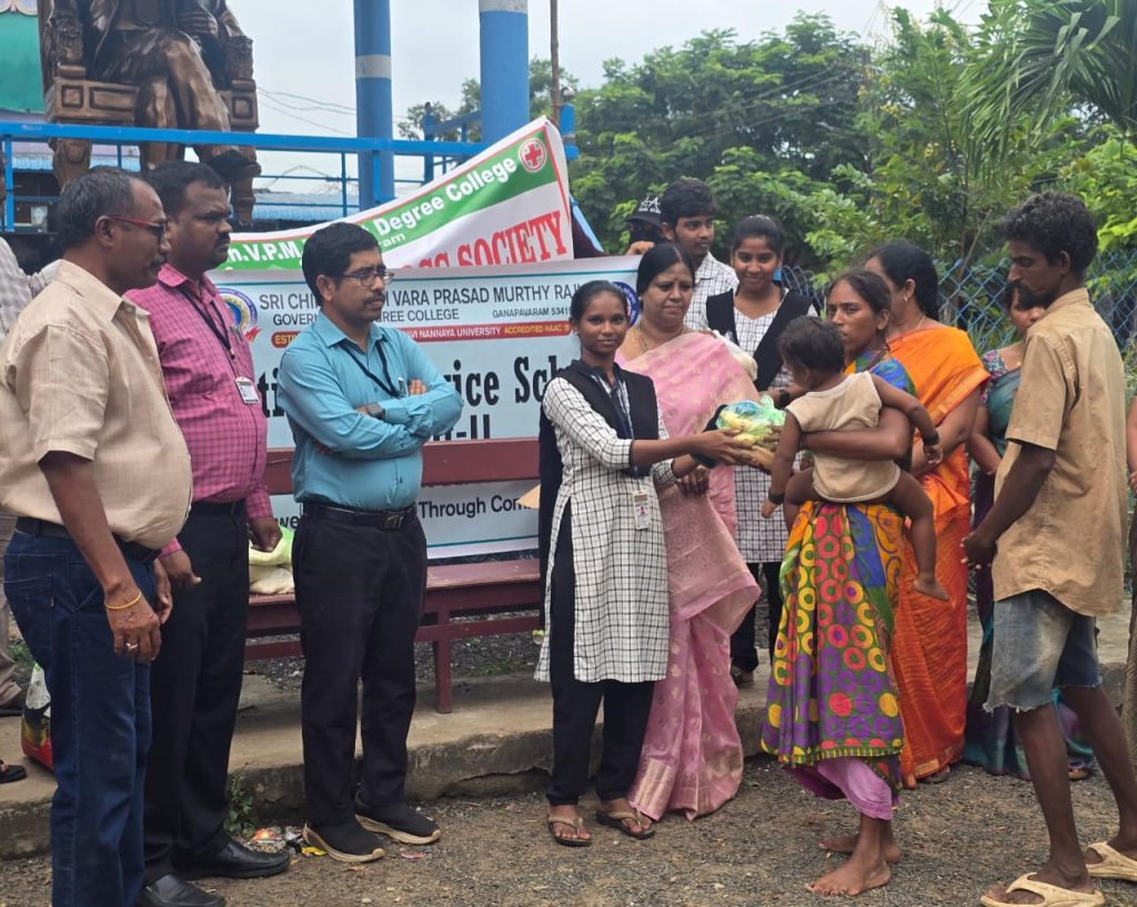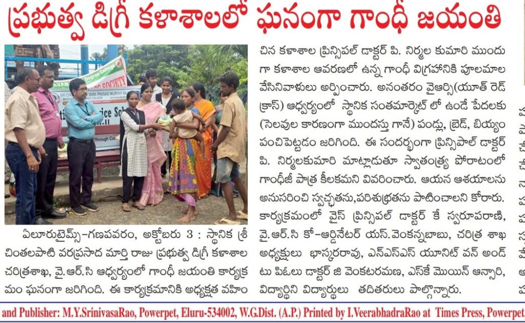 The Department of History and the Youth Red Cross (YRC) Unit of S.CH.V.P.M.R. Government Degree College, Ganapavaram, jointly celebrated Gandhi Jayanthi on 2nd October 2025. On this occasion, YRC volunteers distributed fruits to the underprivileged in the Ganapavaram market area, spreading the message of service and compassion.