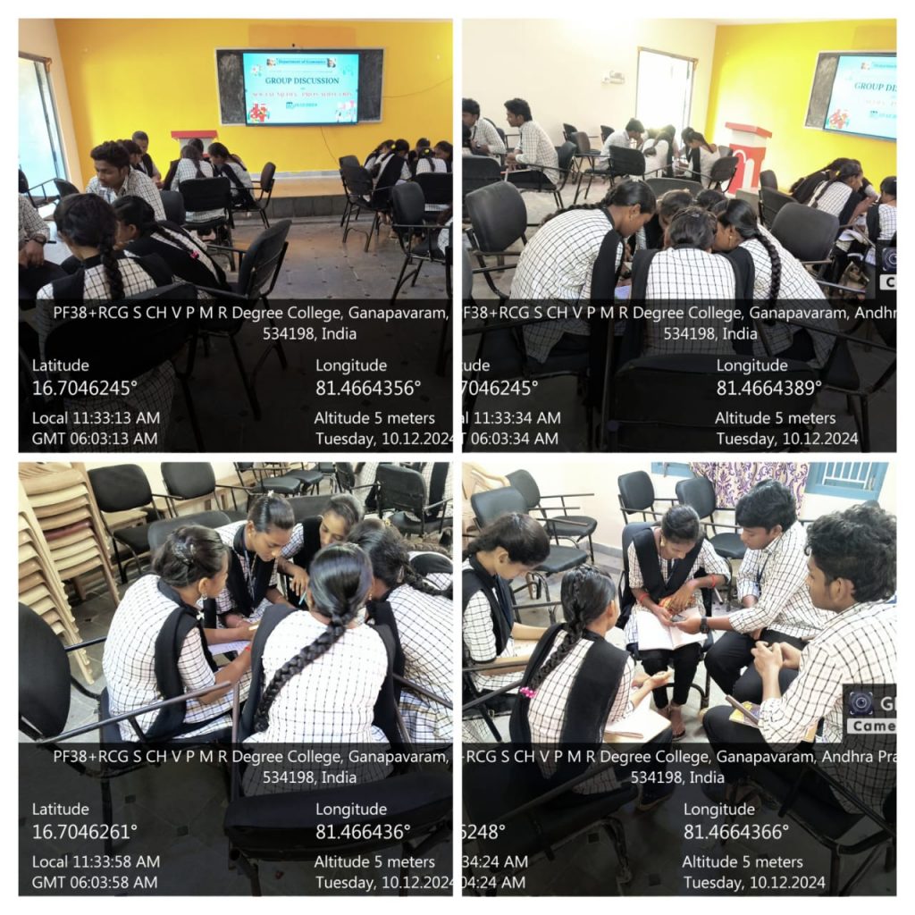 Dept of Economics Organized a group discussion for I BA students on the topic “SOCIAL MEDIA – PROS AND CONS”. The discussion aimed to explore the advantages and disadvantages of social media and its impact on students in particular and society in general. Points discussed Pros Connectivity Information sharing Business and career Opportunities Cons Time killing Cyberbullying Misinformation Addiction and distraction Suggestions Responsible use Platform regulation Time setting 25 students were divided into four groups for the discussion. Discussion went well and students realized the negative impact of social media. After the discussion, students noted the points discussed and recorded for future reference. Discussion Highlights Time saving Money saving Human disconnect Human connect Exposure to unwanted things like betting apps. Which can potentially leads to the loss of money – Approaching unregulated loan providers – Stress – Suicides… Girls must be careful while sharing things Boys must be ethical External control measures to limit the usage time