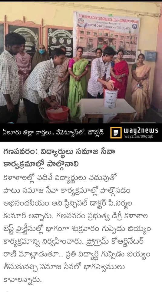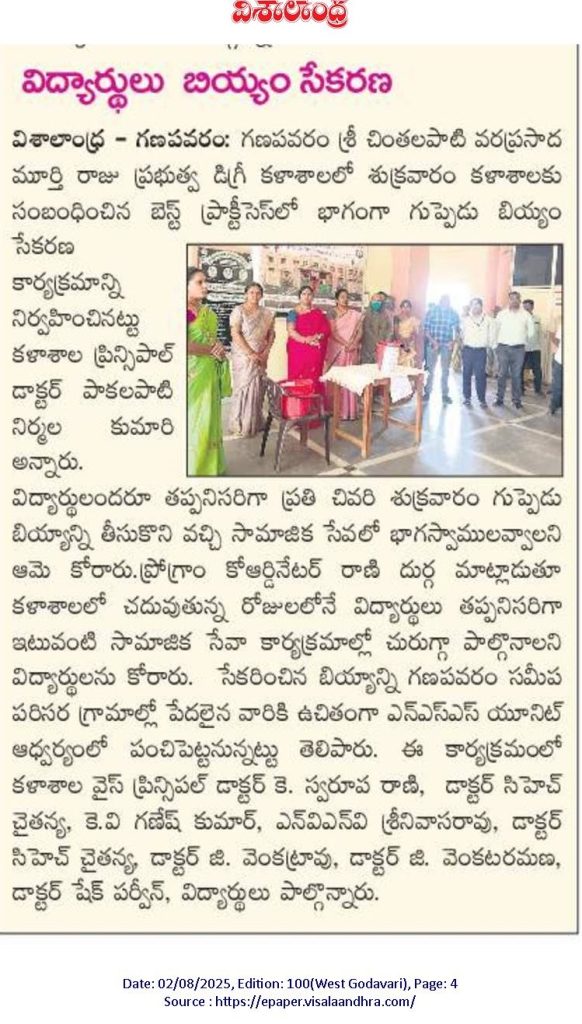 As part of its commitment to social responsibility and community outreach, Government Degree College, Ganapavaram conducted a “Handful of Rice” (Kuppati Biyyam) donation drive on 01st August 2025. The program was organized under the coordination of Smt. B. Rani Durga, Lecturer in Commerce and Handful of Rice Program Coordinator.