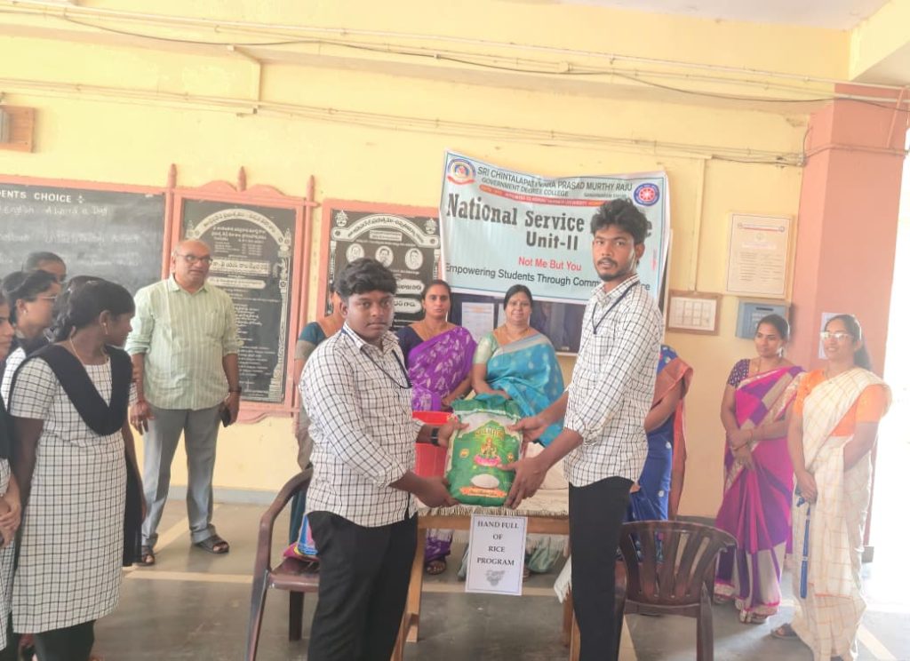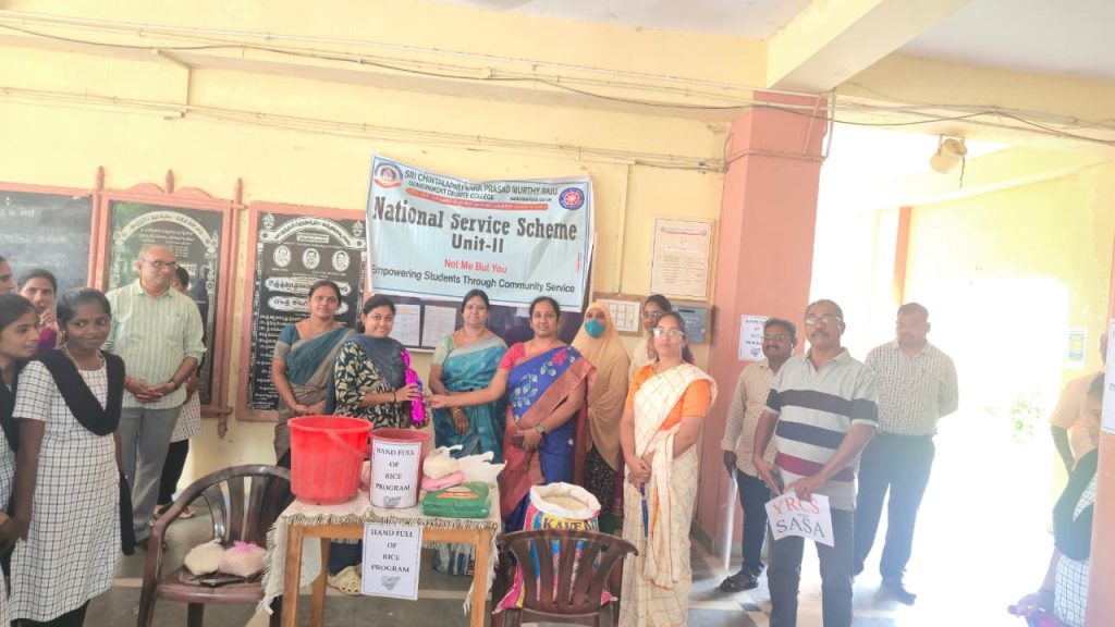On 23rd September 2025, GDC Ganapavaram conducted the Handful of Rice Program, encouraging students to contribute rice as a gesture of compassion and social responsibility. The collected rice will be utilized to support the needy, fostering the values of empathy, sharing, and community service among students. The activity was coordinated by Smt. B. Rani Durga, Lecturer in Commerce under the guidance of Principal Dr.P.Nirmala Kumari.