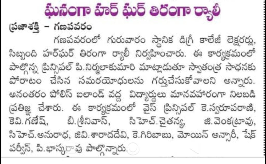 As part of Azadi Ka Amrit Mahotsav, Sri Chintalapati Varaparasada Murthy Raju Government Degree College, Ganapavaram actively participated in the Har Ghar Tiranga Campaign from 13.08.2025 to 15.08.2025, in line with the directions of the Government of India, Government of Andhra Pradesh, and NSS Cell, Adikavi Nannaya University.