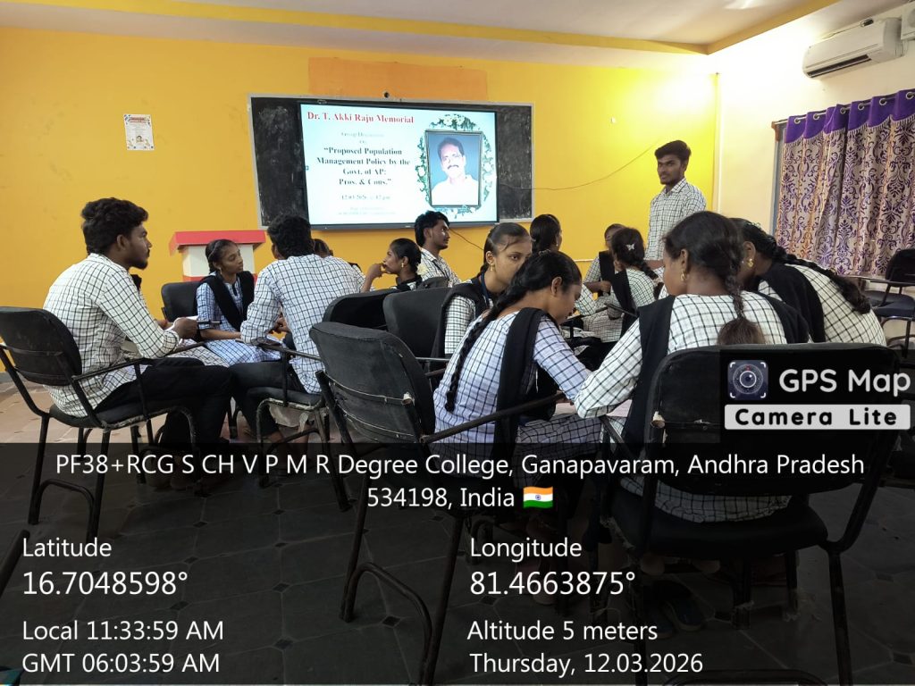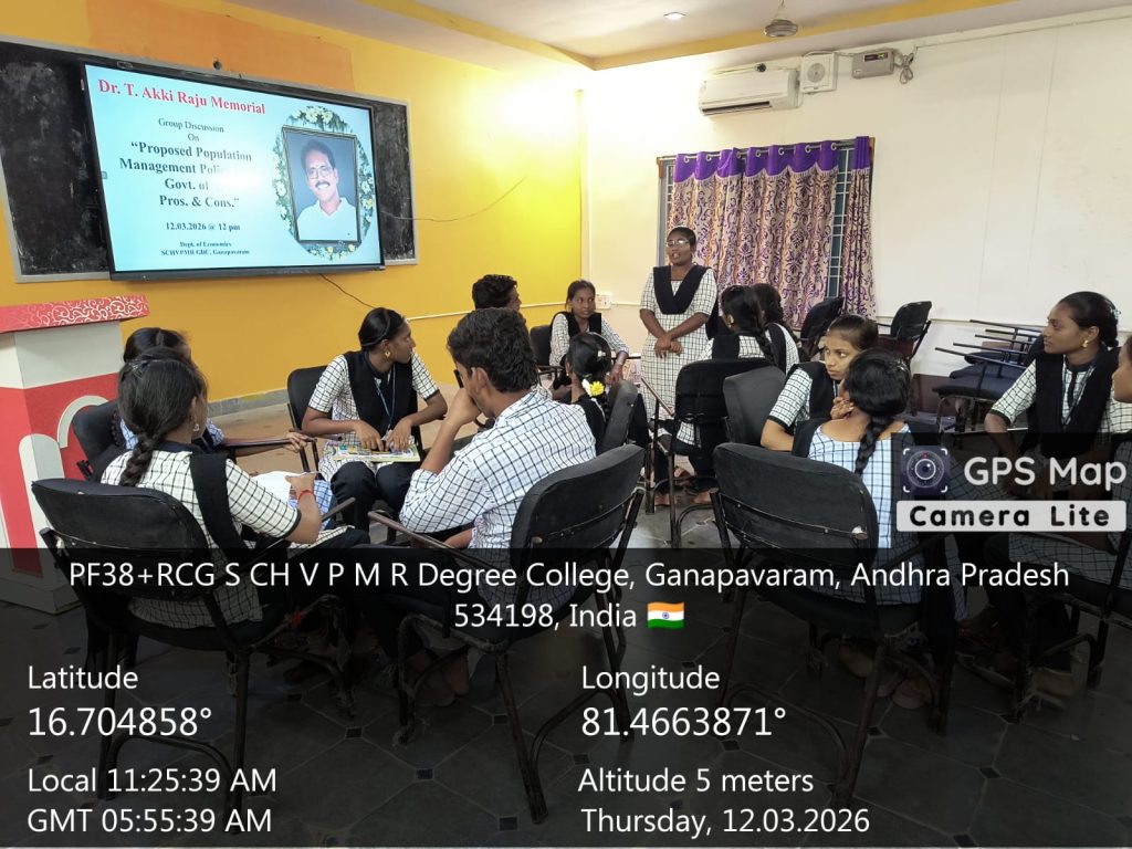 A thought-provoking Group Discussion on the topic “Proposed Population Management Policy by the Government of Andhra Pradesh – Pros and Cons” was successfully organized on 12th March 2026 by the Department of Economics at S.Ch.V.P.M.R. Government Degree College, Ganapavaram.