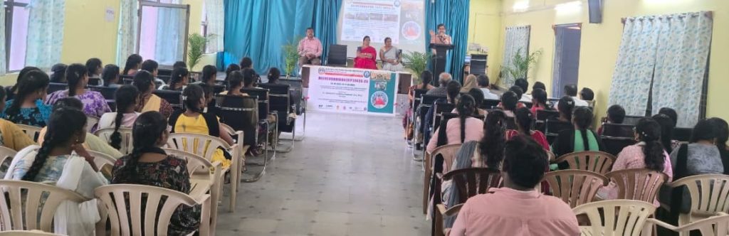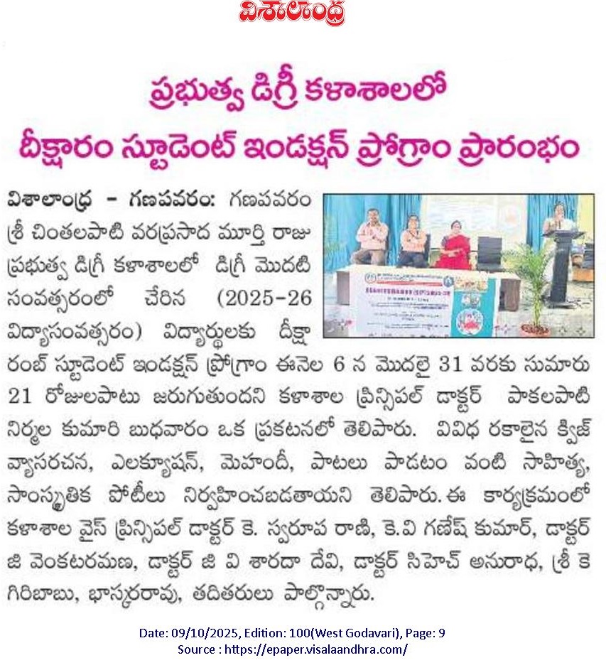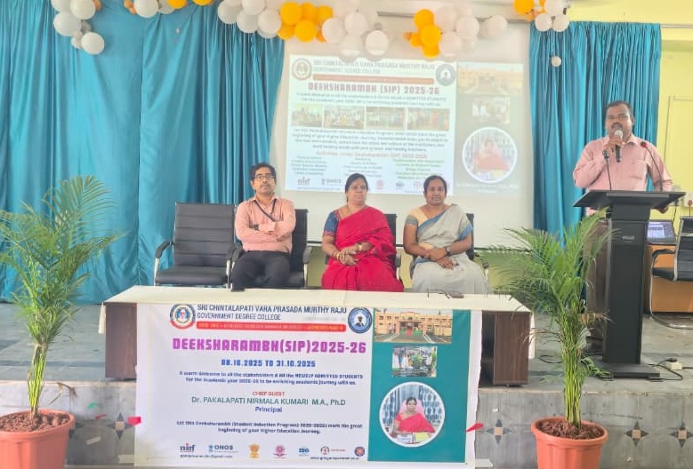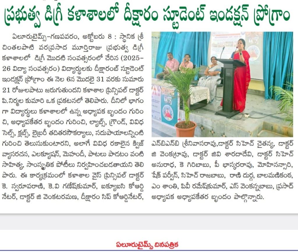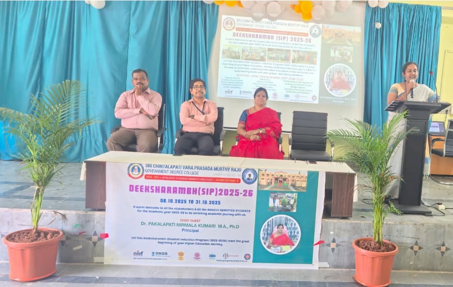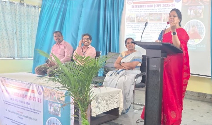 The college inaugurated the Deeksharambh (Student Induction Program) for newly admitted students of the academic year 2025–26. The Principal, Dr. P. Nirmala Kumari, warmly welcomed the freshers and encouraged them to actively participate in the 21-day program, which aims to help students get acquainted with the college environment, departments, faculty, support services, and campus facilities.