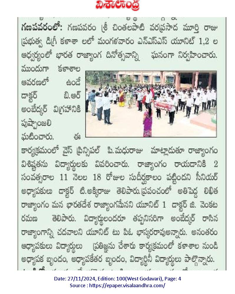 GDC Ganapavaram celebrated Indian Constitution Day on 26.11.2024, organized by NSS Units 1 & 2 to honor the adoption of the Constitution of India and promote awareness about its principles among students.