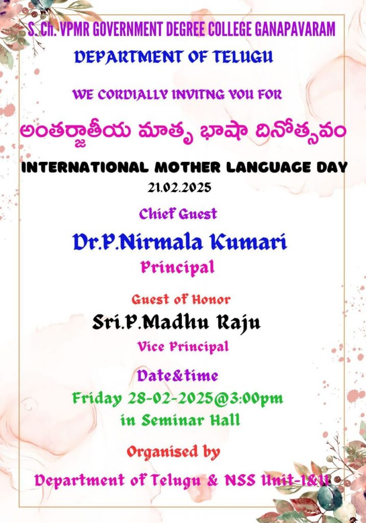 GDC Ganapavaram conducted a meeting on 28.02.2025 commemorating International Mother Language DayFebruary 21 to promote the significance of linguistic diversity and the preservation of Telugu language. The event was conducted by Dr. G. Venkata Ramana, Lecturer in Telugu, who emphasized the beauty and cultural richness of regional languages.