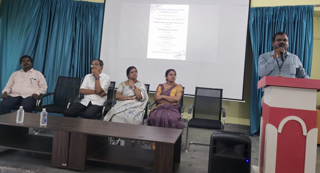 Principal Dr. P. Nirmala Kumari highlighted the role of mother tongues in shaping identity and communication. Vice Principal Sri P. Madhu Raju spoke about the importance of language in education and knowledge transmission, while IQAC Coordinator Dr. Ch. Chaitanya stressed the need to preserve and promote native languages in the digital era.