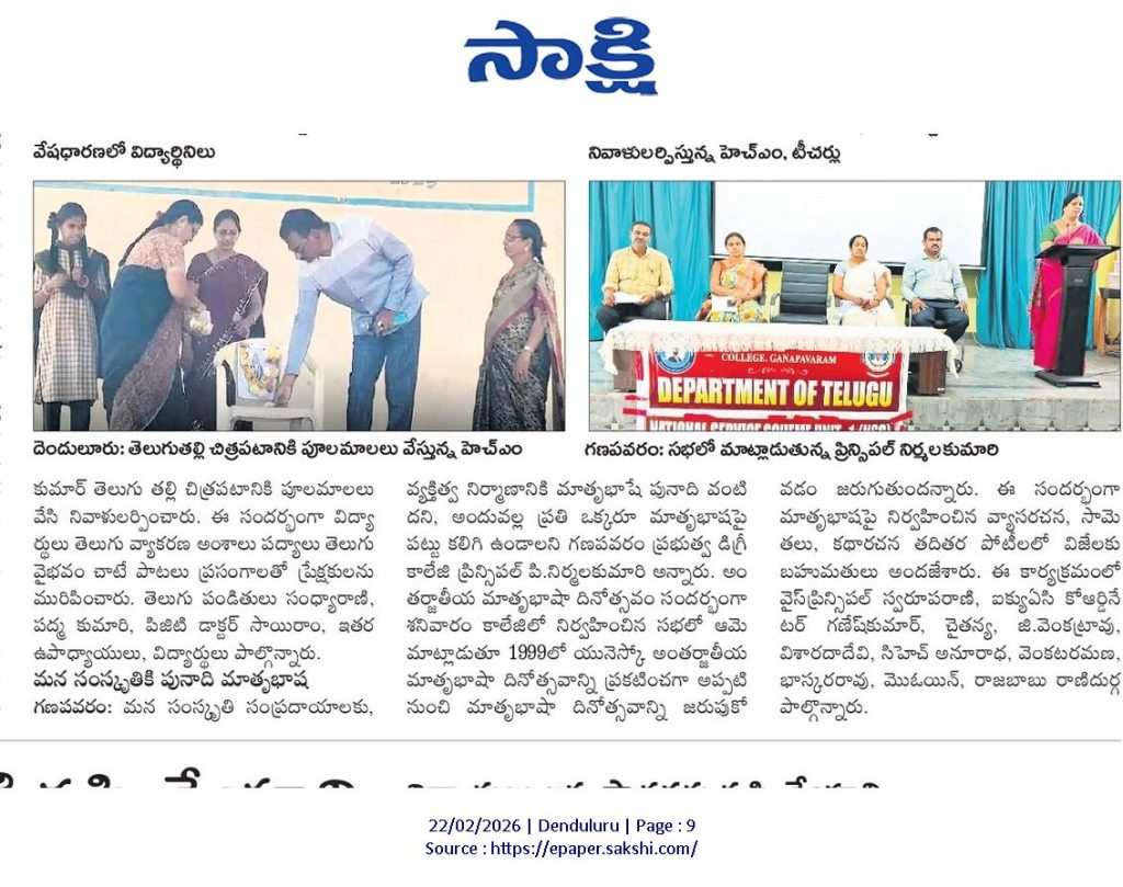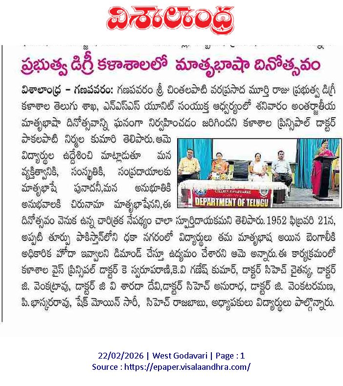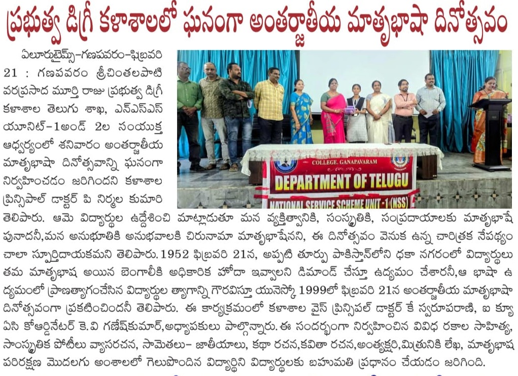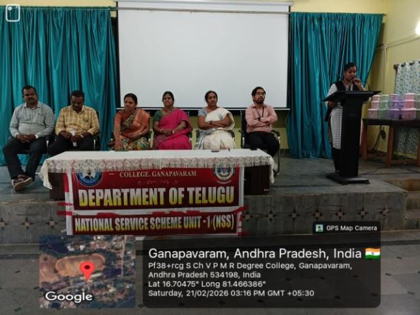 The Department of Telugu and NSS Units I & II of S.Ch.V.P.M.R. Government Degree College, Ganapavaram jointly organized the celebration of International Mother Language Day with great enthusiasm and spirit.
