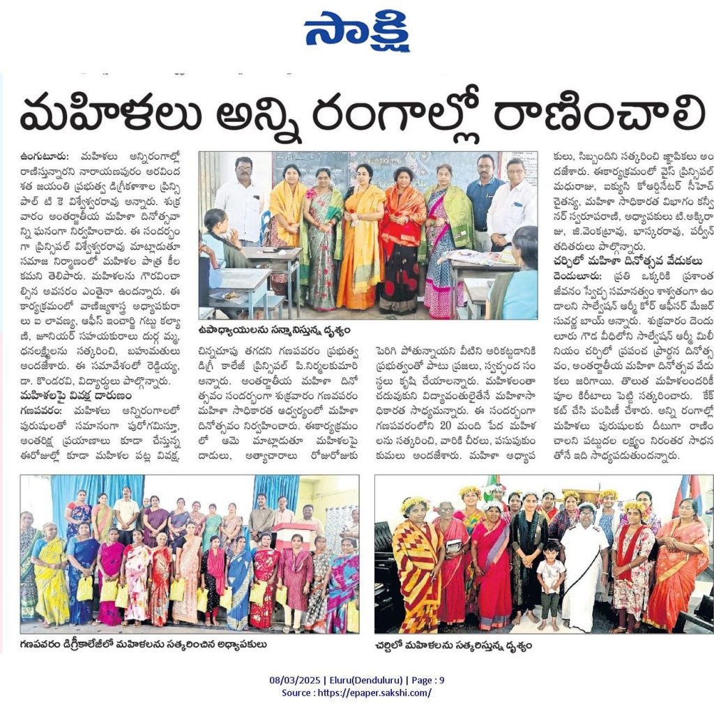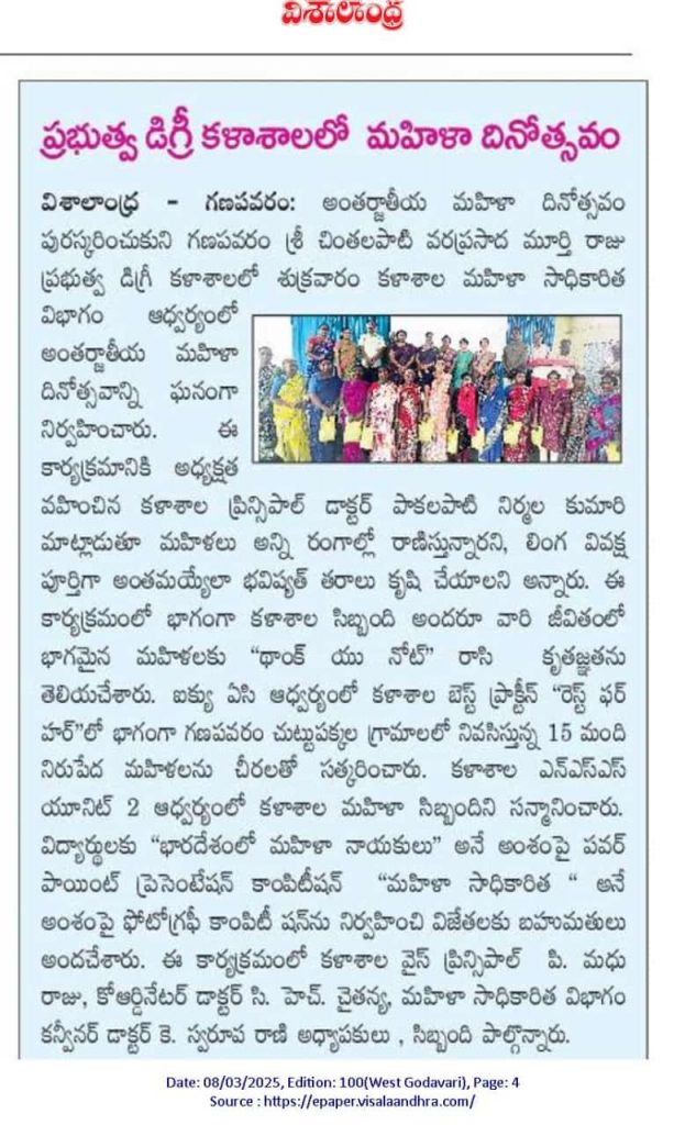 The Women Empowerment Cell (WEC) of Sri Chintalapati Varaprasada Murthy Raju Government Degree College, Ganapavaram, organized International Women’s Day 8th March on 07.03.2025 to honor and celebrate the achievements and contributions of women in society. The event aimed to promote gender equality and acknowledge the efforts of women from diverse backgrounds.