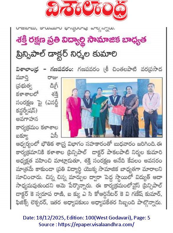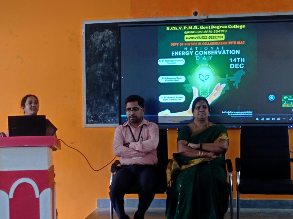 Sri Chintalapati Vara Prasada Murthy Raju Government Degree College, Ganapavaram conducted an IQAC Quality Initiative on Energy Conservation titled “WattWatch @ GDC Ganapavaram – Smart Energy, Smart Campus” on 15 December 2025, in collaboration with the Department of Physics.
