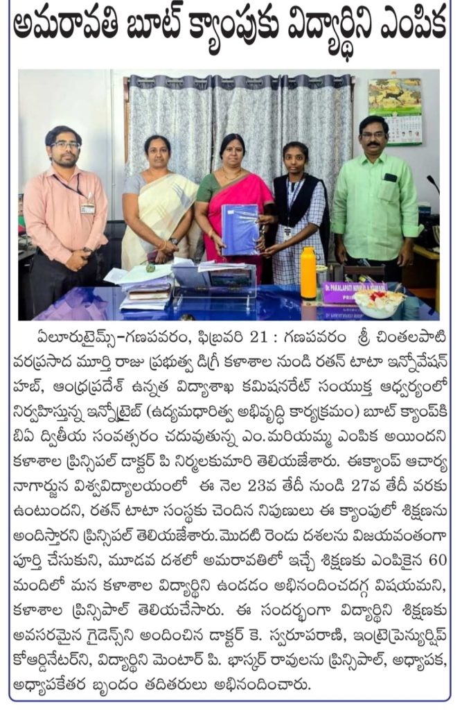 S.Ch.V.P.M.R. Government Degree College, Ganapavaram proudly announces that Ms. M. China Mariyamma, II B.A. (Honours) Economics, has been selected for the prestigious RTIH-CCE Amaravati Pilot: Student Entrepreneurship Programme – 5-Day Intensive Bootcamp.