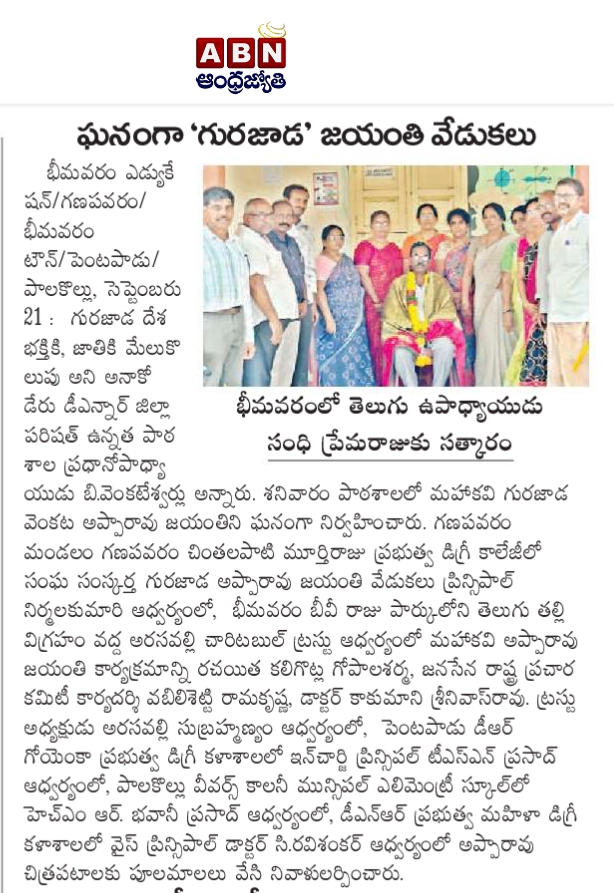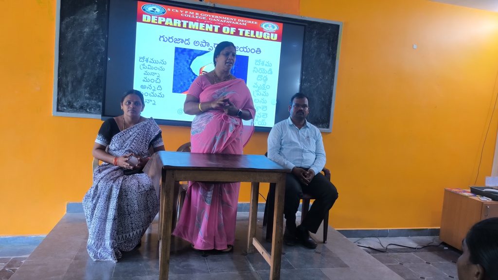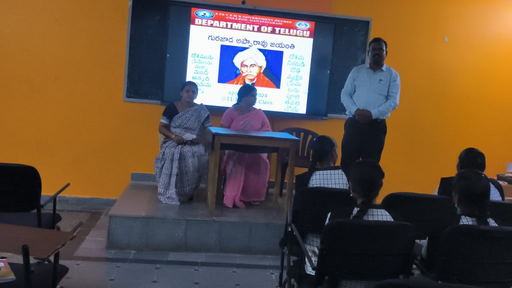 Today, on the occasion of the birth anniversary of the great poet, modern poet, and a stalwart who made immense contributions to colloquial language, Gurajada Venkata Apparao, a celebration was organized under the aegis of the Telugu Department at Chintalapati Varaprasad Murthy Raju Government Degree College. The event was presided over by Principal Dr. P. Nirmala Kumari, who addressed the students and spoke about Gurajada Apparao’s contributions. Principal madam mentioned that the song Puttadi Bomma Poornamma written by Gurajada is unforgettable.