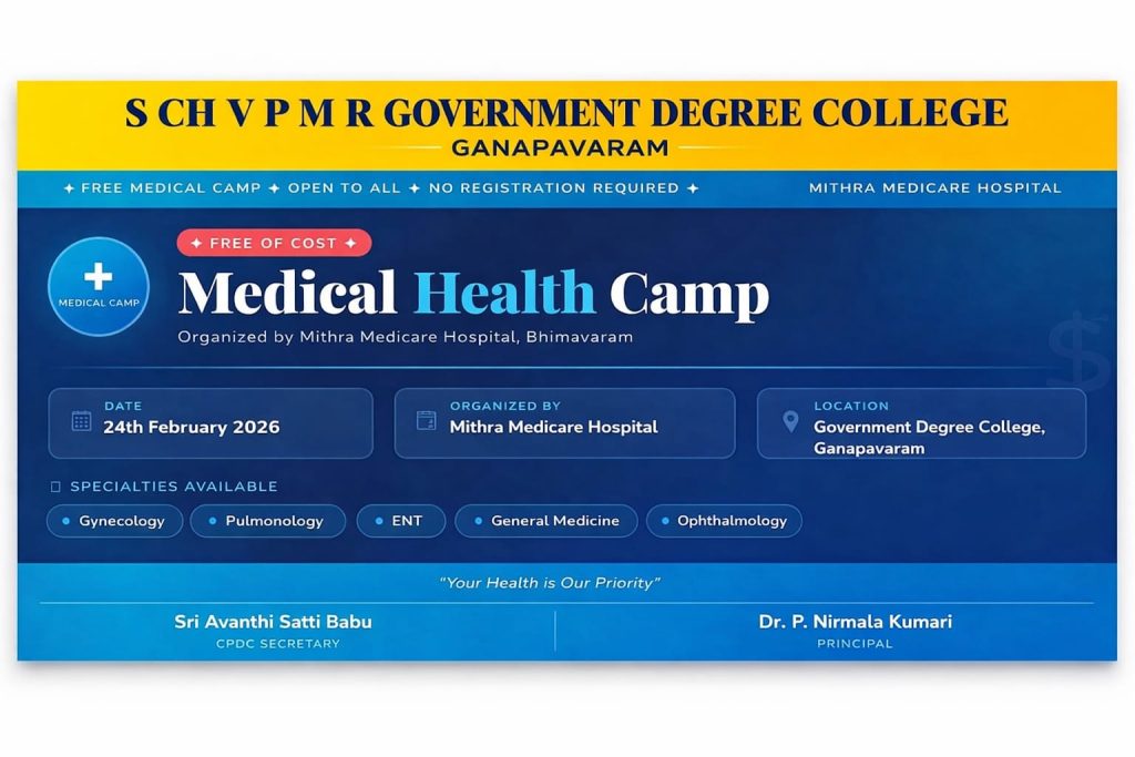 A Multi-Specialty Medical Camp was successfully conducted on 24.02.2026 at S.Ch.V.P.M.R. Government Degree College, Ganapavaram by Mithra Medicare Hospital, Bhimavaram, in association with the college NSS Units I & II and Youth Red Cross (YRC).