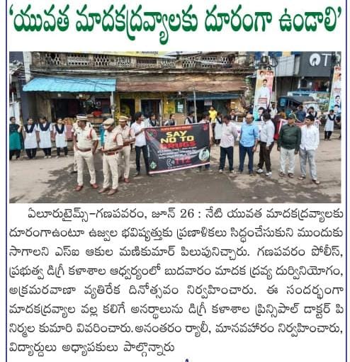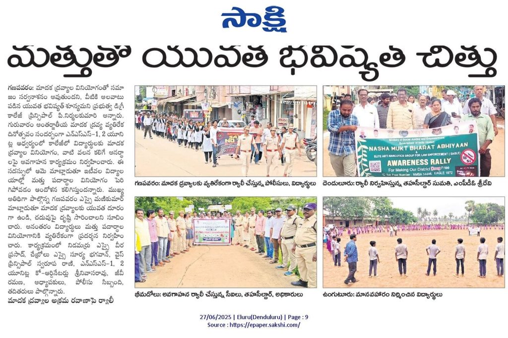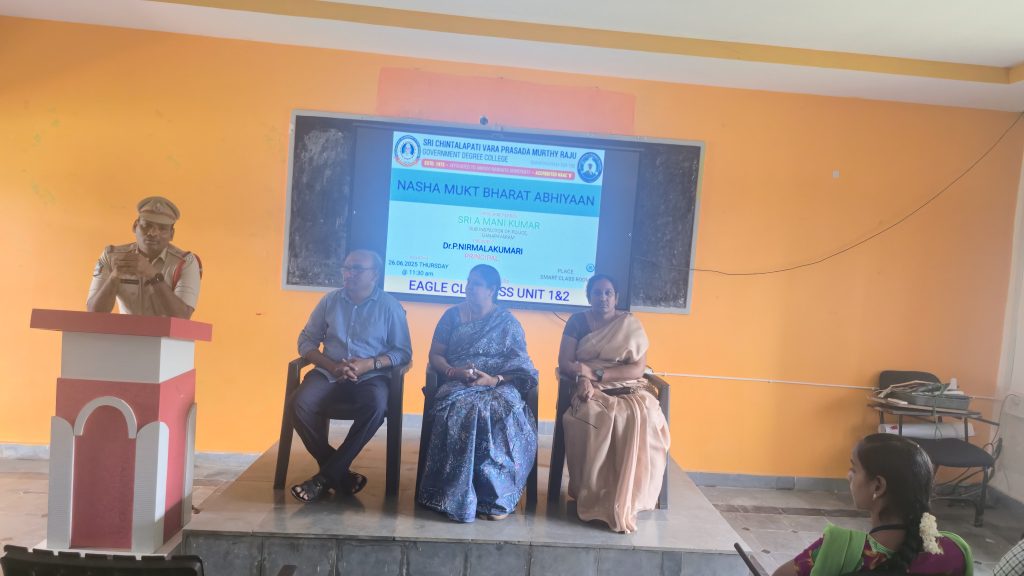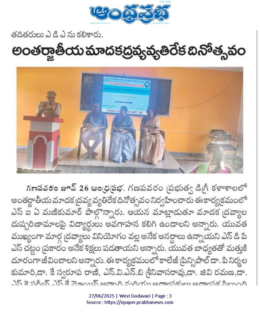 In compliance with the guidelines of APCCE and under the leadership of Principal Dr. P. Nirmala Kumari, Government Degree College, Ganapavaram observed the International Day Against Drug Abuse and Illicit Trafficking on 26th June 2025 as part of the Nasha Mukth Bharat Abhiyaan (NMBA).