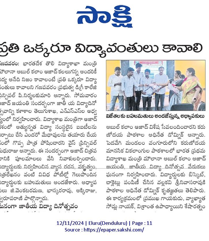 The Department of Telugu and NSS units of the college jointly organized National Education Day on 11.11.2024 in honor of the birth anniversary of Maulana Abul Kalam Azad, the first Education Minister of the Government of India. The event was presided over by the college’s Vice Principal, Sri P. Madhu Raju. Addressing the students, sir spoke about Azad’s pivotal role as the first Education Minister of independent India, highlighting his contributions to establishing IITs and several other national educational institutions. He emphasized the importance of education in modern society, especially advocating for the promotion of women’s education.