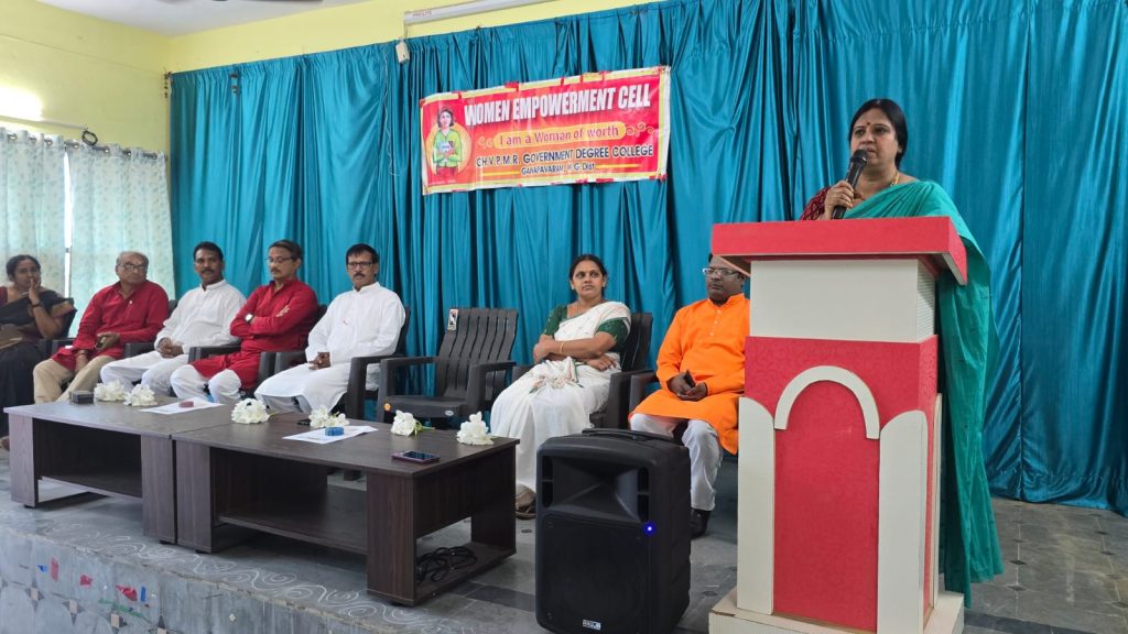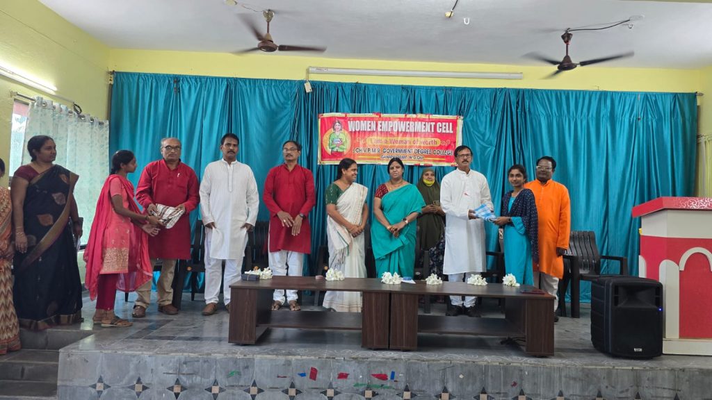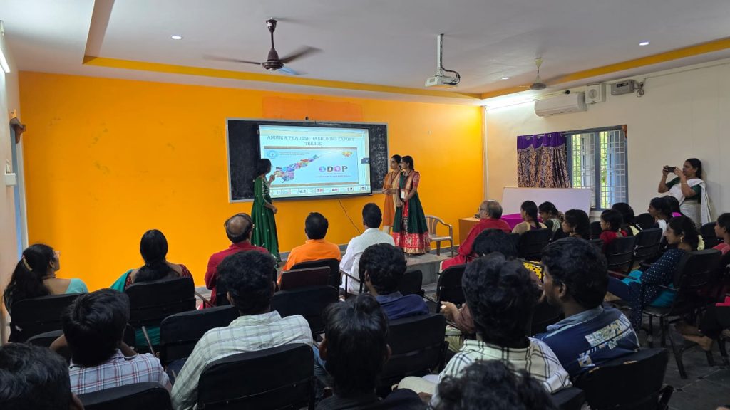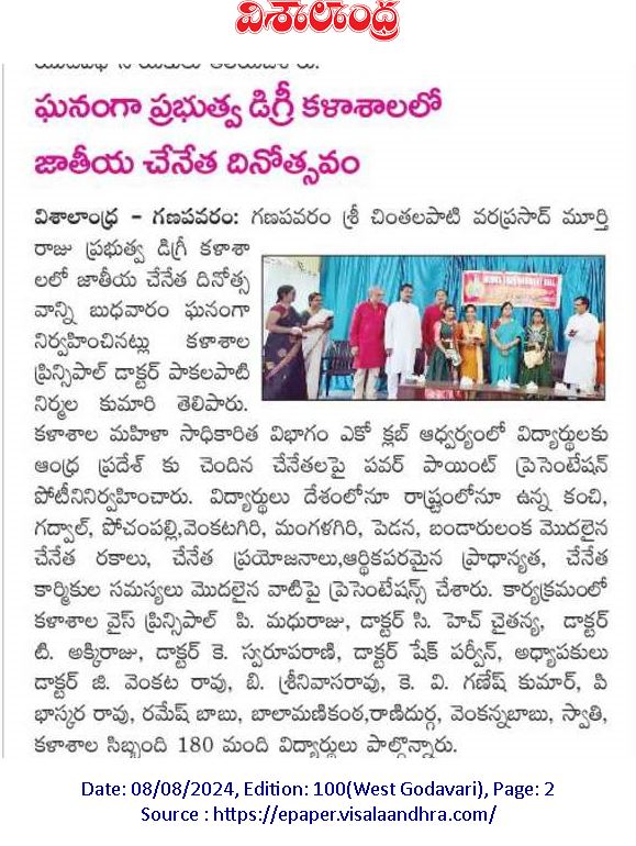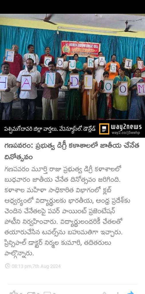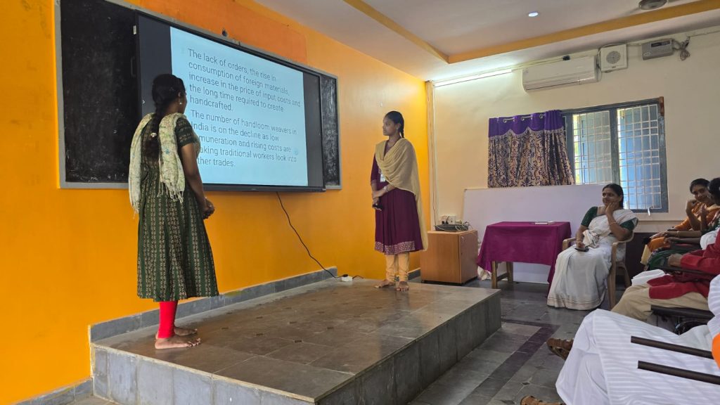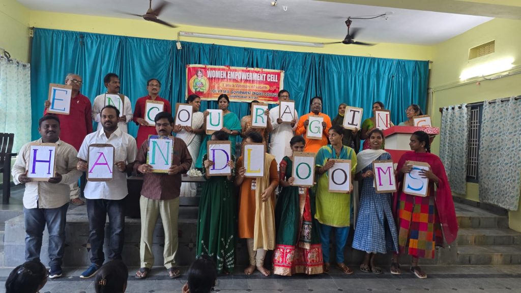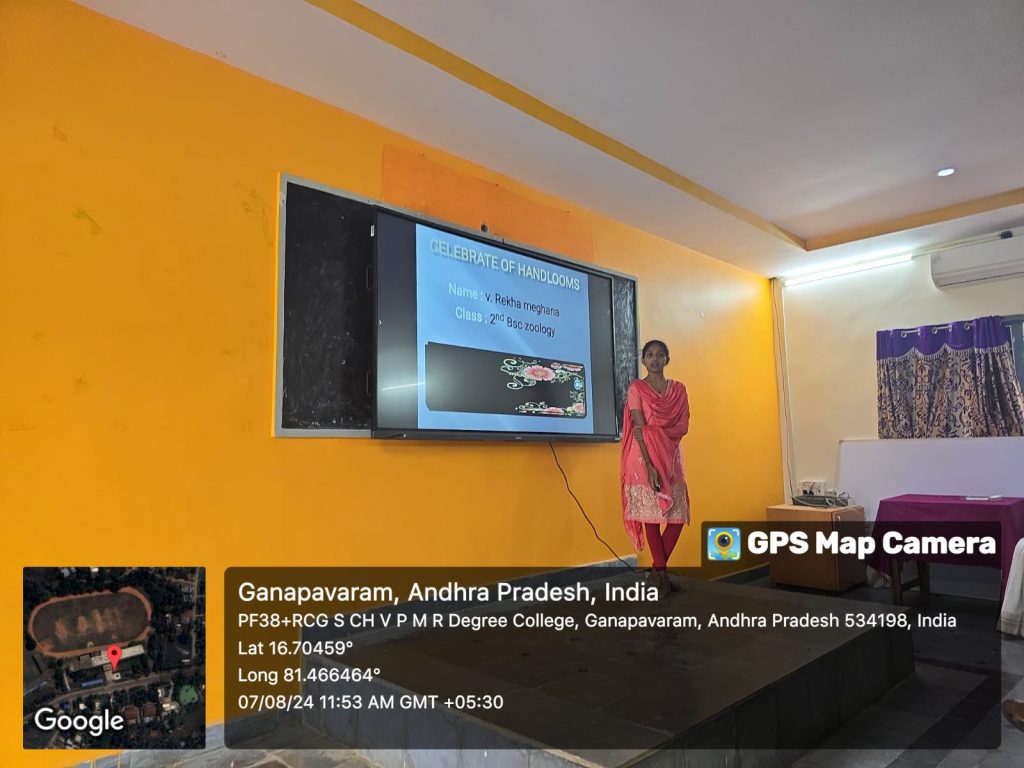 On 7th August 2024, we conducted a PPT-making and presentation competition for students on the theme “Handlooms of India/Andhra Pradesh.” Three teams participated: Manjunadheswari, Samyuktha, and Akshita from III MPCS; Mounika from III BZC; and Durga and Jessy from III BCOM. They presented their PPTs covering different fabrics and designs of Indian and AP handlooms, as well as the challenges faced by handloom weavers. All the presentations were excellent, and the participants received handloom towels as a token of appreciation from our principal.