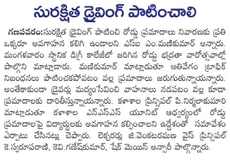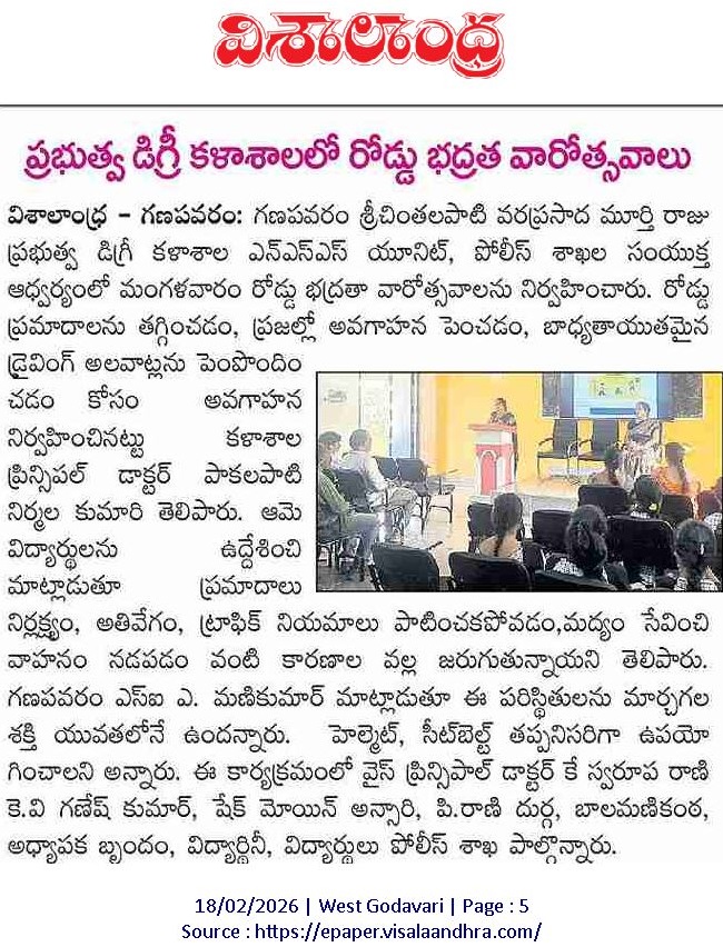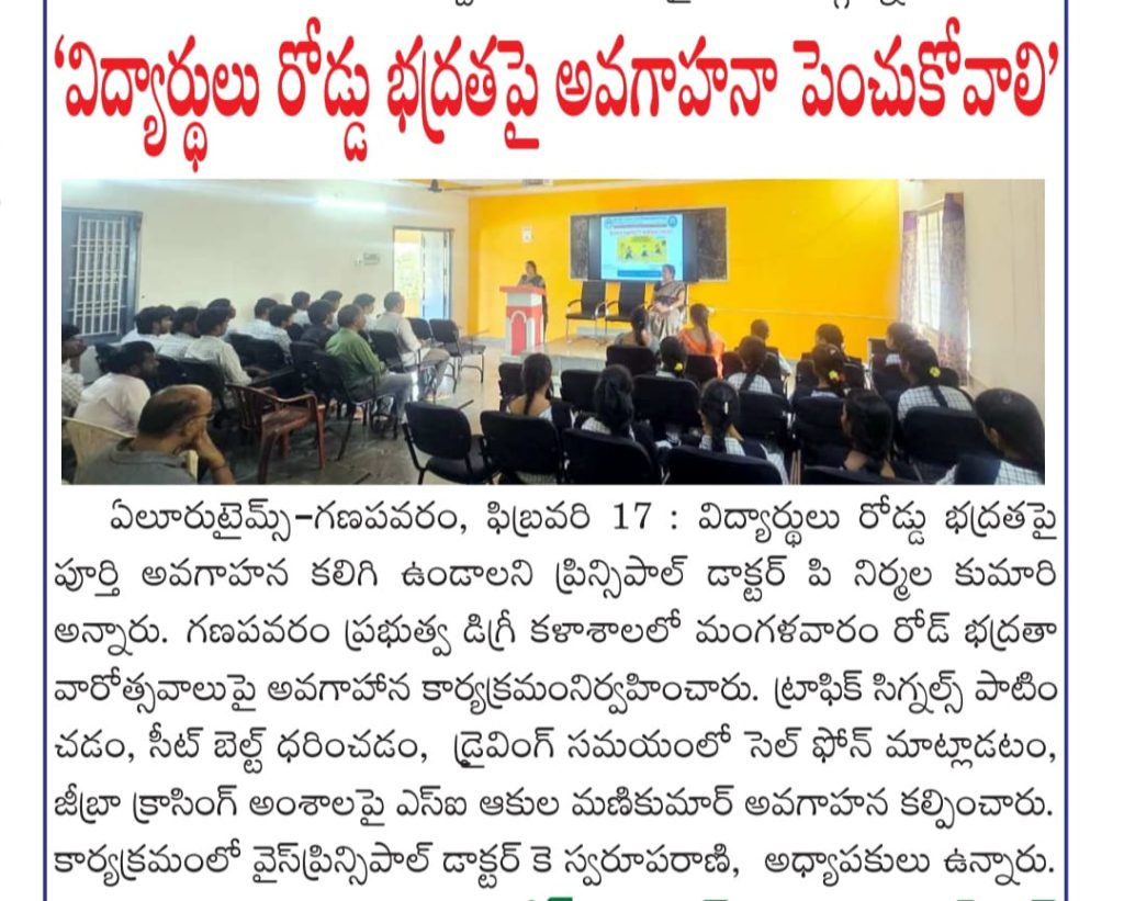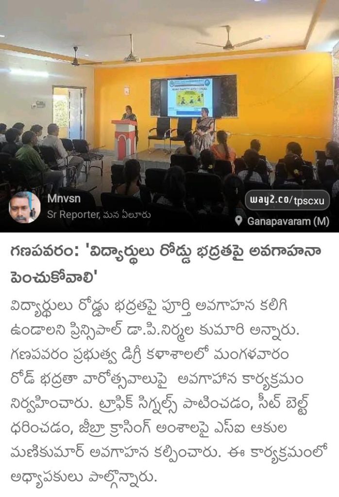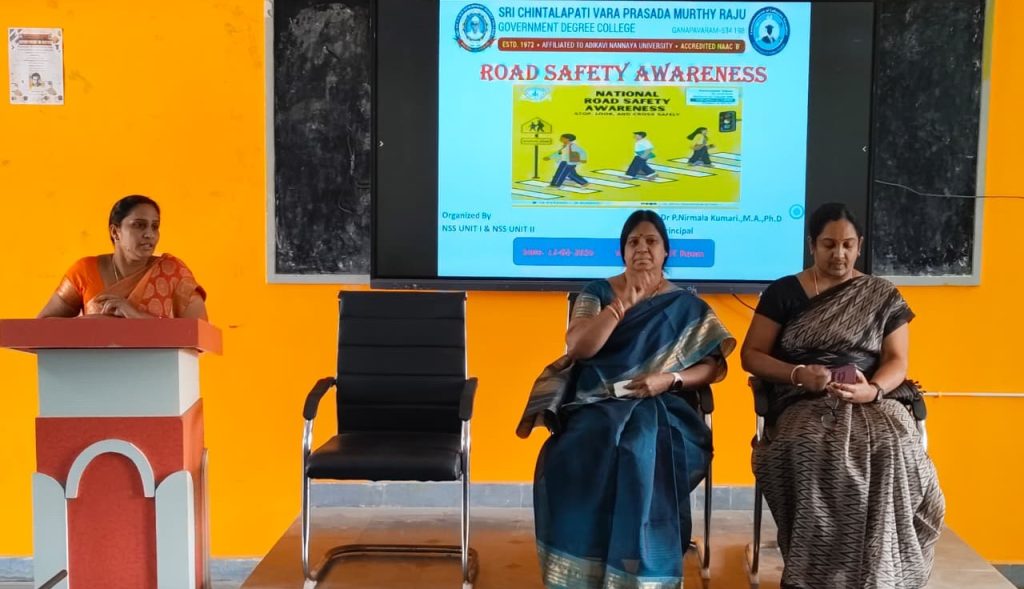 The NSS Units I & II of S.Ch.V.P.M.R. Government Degree College, Ganapavaram organized a National Road Safety Awareness Programme in collaboration with the Police Department to create awareness among students on road safety rules and responsible behaviour.