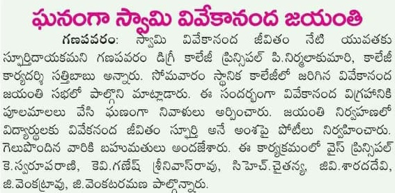 National Youth Day, commemorating the birth anniversary of Swami Vivekananda, was observed on 12 January 2026 at Sri Chintalapati Vara Prasada Murthy Raju Government Degree College, Ganapavaram by NSS Units I & II, with the objective of inspiring youth through the ideals and teachings of Swami Vivekananda.
