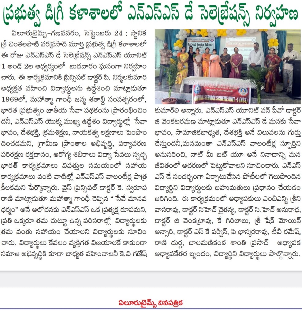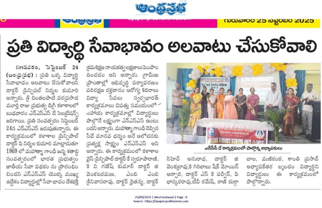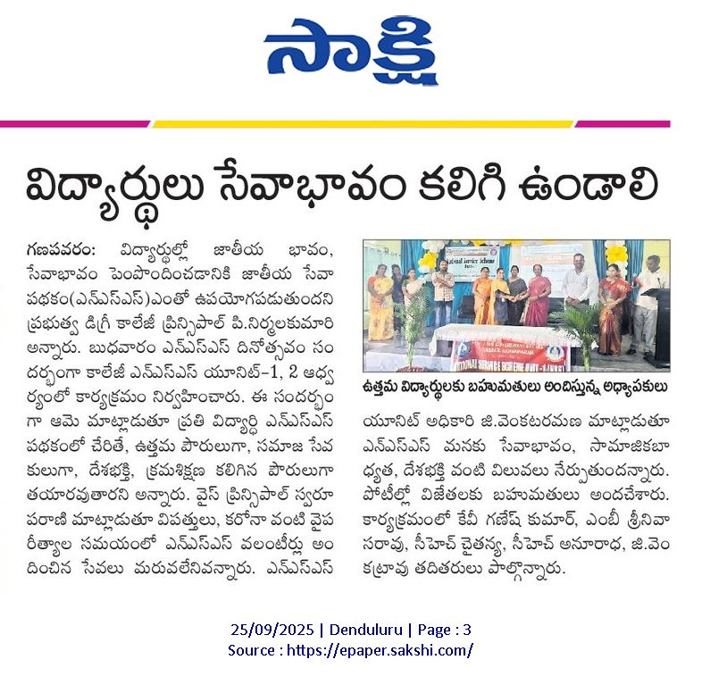 Government Degree College, Ganapavaram, observed National Service Scheme (NSS) Day on 24th September 2025 with great enthusiasm. The program highlighted the values of service, discipline, and social responsibility among students.