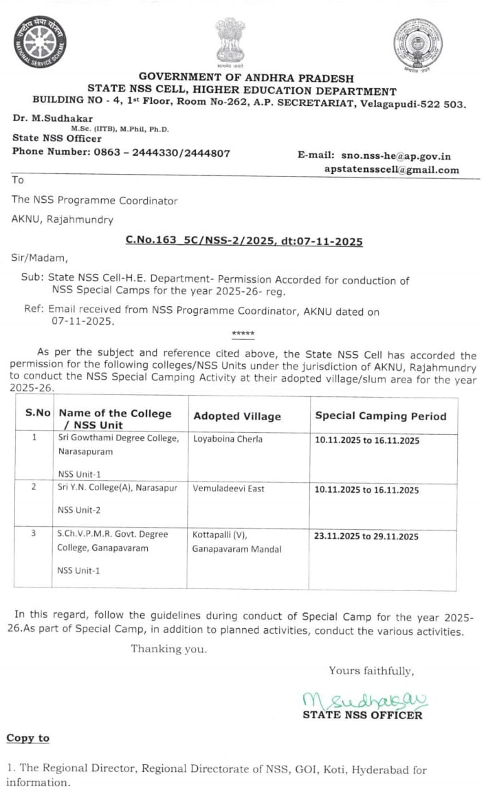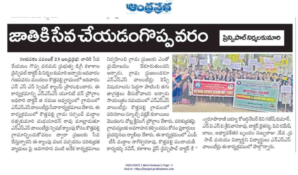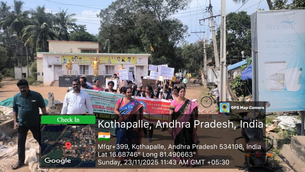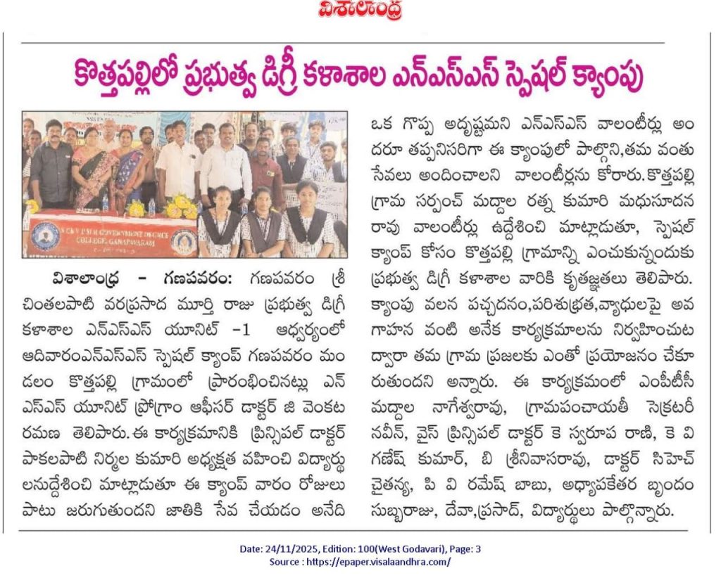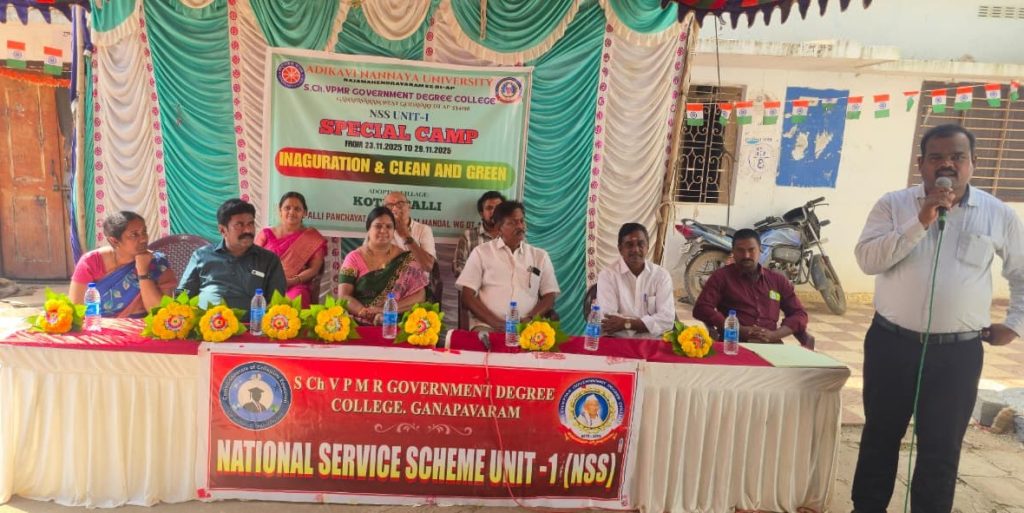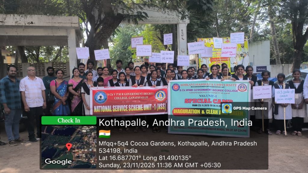 The NSS Unit–I of S.Ch.V.P.M.R. Government Degree College, Ganapavaram began the 7-Day NSS Special Camp with 50 Student Volunteers on 23 November 2025 at Kottapalli Village, Saripalle Panchayat, Ganapavaram Mandal, West Godavari District. The camp is being conducted under the guidance of NSS Programme Officer Dr. G. Venkata Ramana.