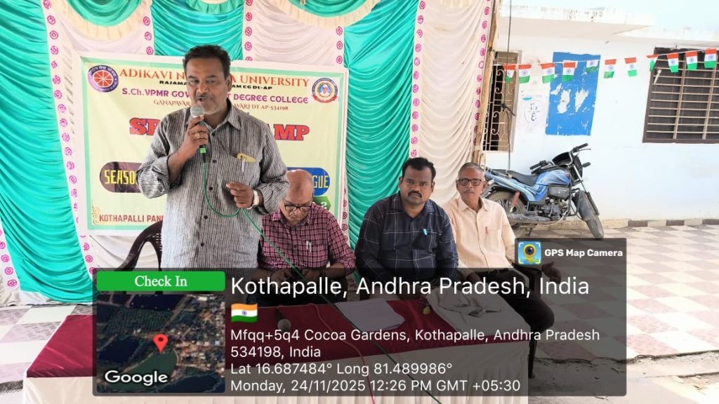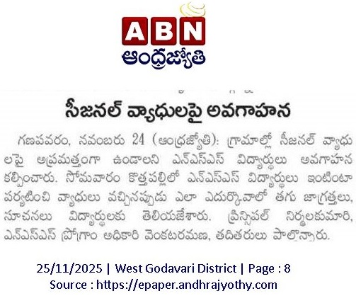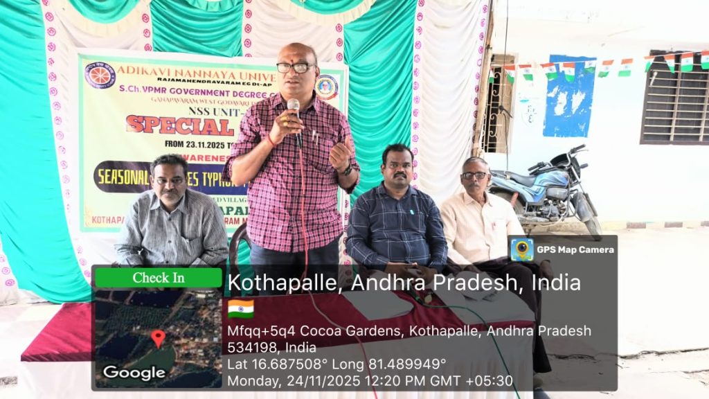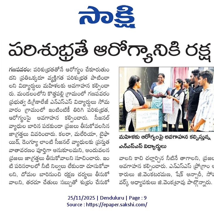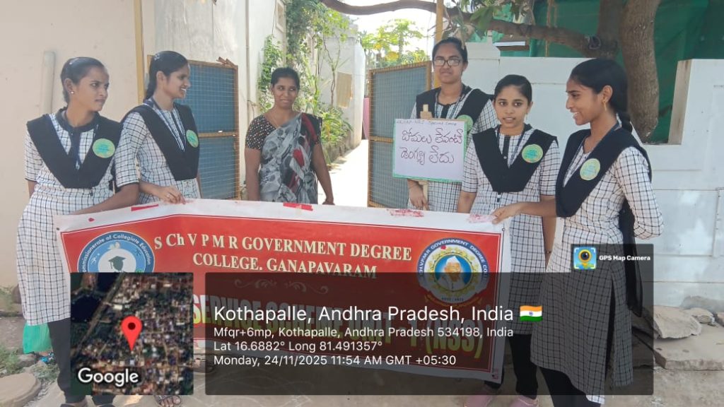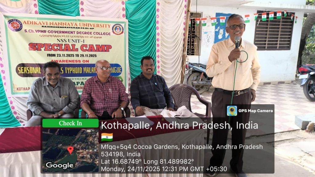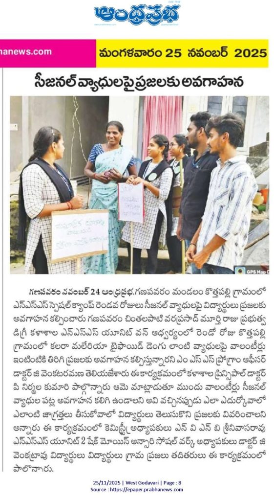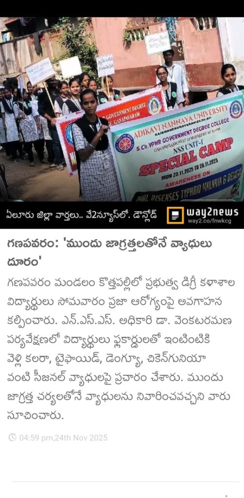 On 24 November 2025, NSS Unit–1 of S.Ch.V.P.M.R. Government Degree College, Ganapavaram conducted Day–2 activities of the ongoing NSS Special Camp at Kottapalli village. The day’s focus was an Awareness Campaign on Seasonal Diseases such as Cholera, Malaria, Typhoid, and Dengue.