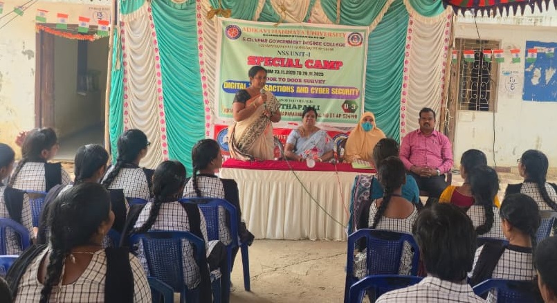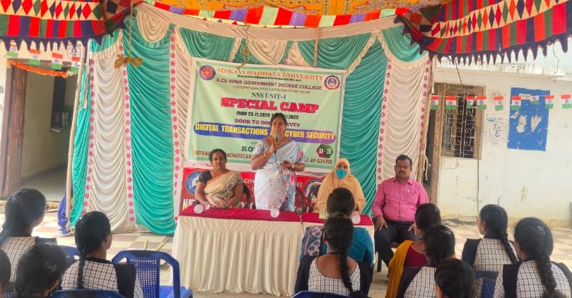 Dr. P. Nirmala Kumari, Principal of the college, delivered an informative lecture on Digital Transactions and Cyber Security, explaining how technology can be used safely for financial transactions, especially in rural areas. Madam urged villagers to be vigilant against fraud and motivated the volunteers to spread authentic awareness.